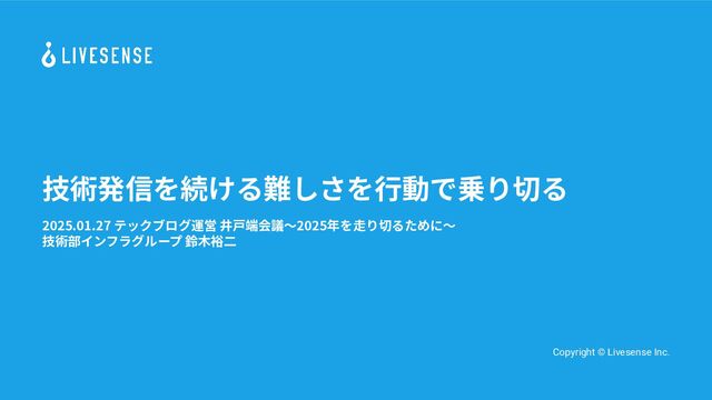 技術発信を続ける難しさを⾏動で乗り切る 2025.01.27 テックブログ運営 井⼾端会議〜2025年を⾛り切るために〜 技術部インフラグループ 鈴⽊裕⼆ Copyright © Livesense Inc.