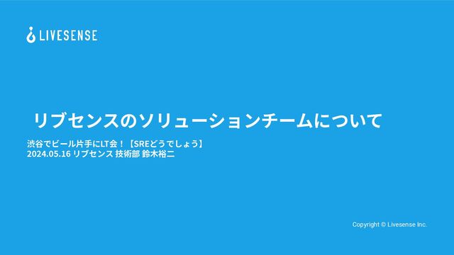 リブセンスのソリューションチームについて 渋⾕でビール⽚⼿にLT会!【SREどうでしょう】 2024.05.16 リブセンス 技術部 鈴⽊裕⼆ Copyright © Livesense Inc.