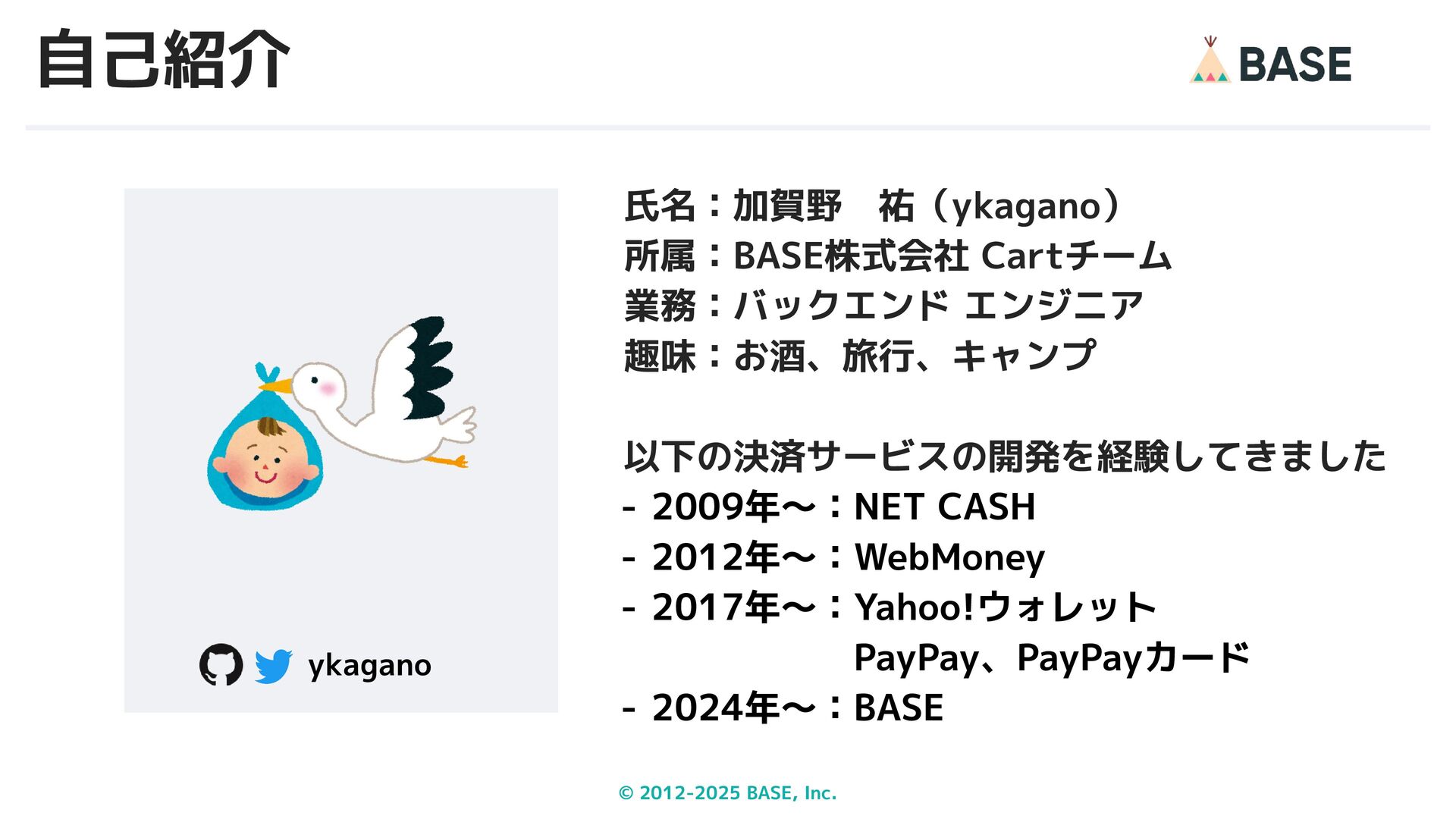 © 2012-2025 BASE, Inc. 2 氏名:加賀野 祐(ykagano) 所属:BASE株式会社 Cartチーム 業務:バックエンド エンジニア