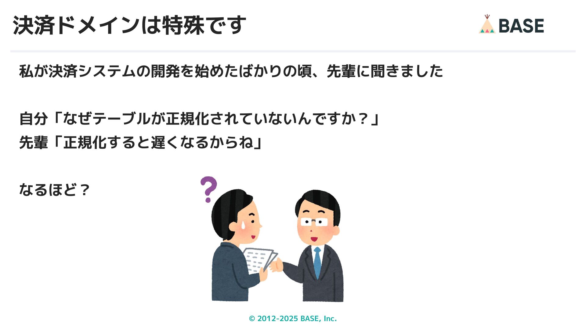 © 2012-2025 BASE, Inc. 決済ドメインは特殊です 12 私が決済システムの開発を始めたばかりの頃、先輩に聞きました 自分「なぜテーブルが正規化されていないんですか?」 先輩「正規化すると遅くなるからね」 なるほど?