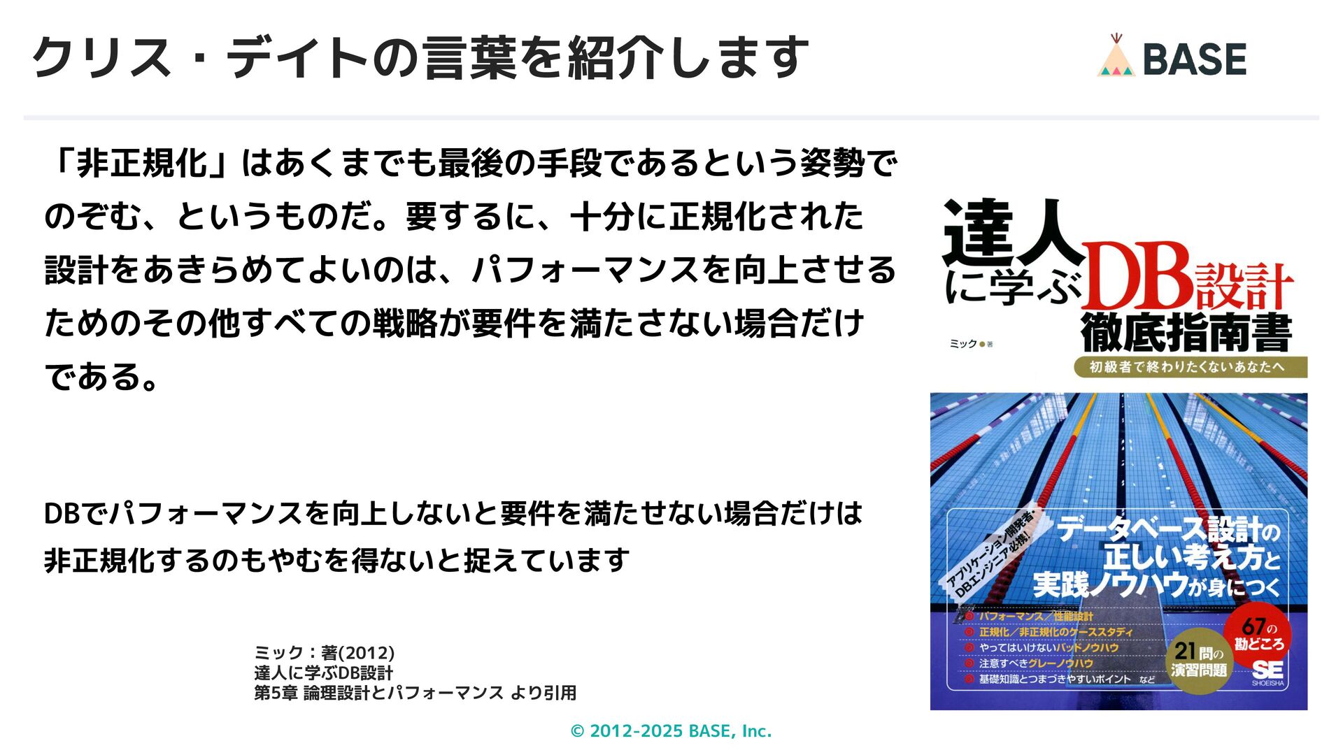 © 2012-2025 BASE, Inc. クリス・デイトの言葉を紹介します 14 「非正規化」はあくまでも最後の手段であるという姿勢で のぞむ、というものだ。要するに、十分に正規化された 設計をあきらめてよいのは、パフォーマンスを向上させる ためのその他すべての戦略が要件を満たさない場合だけ