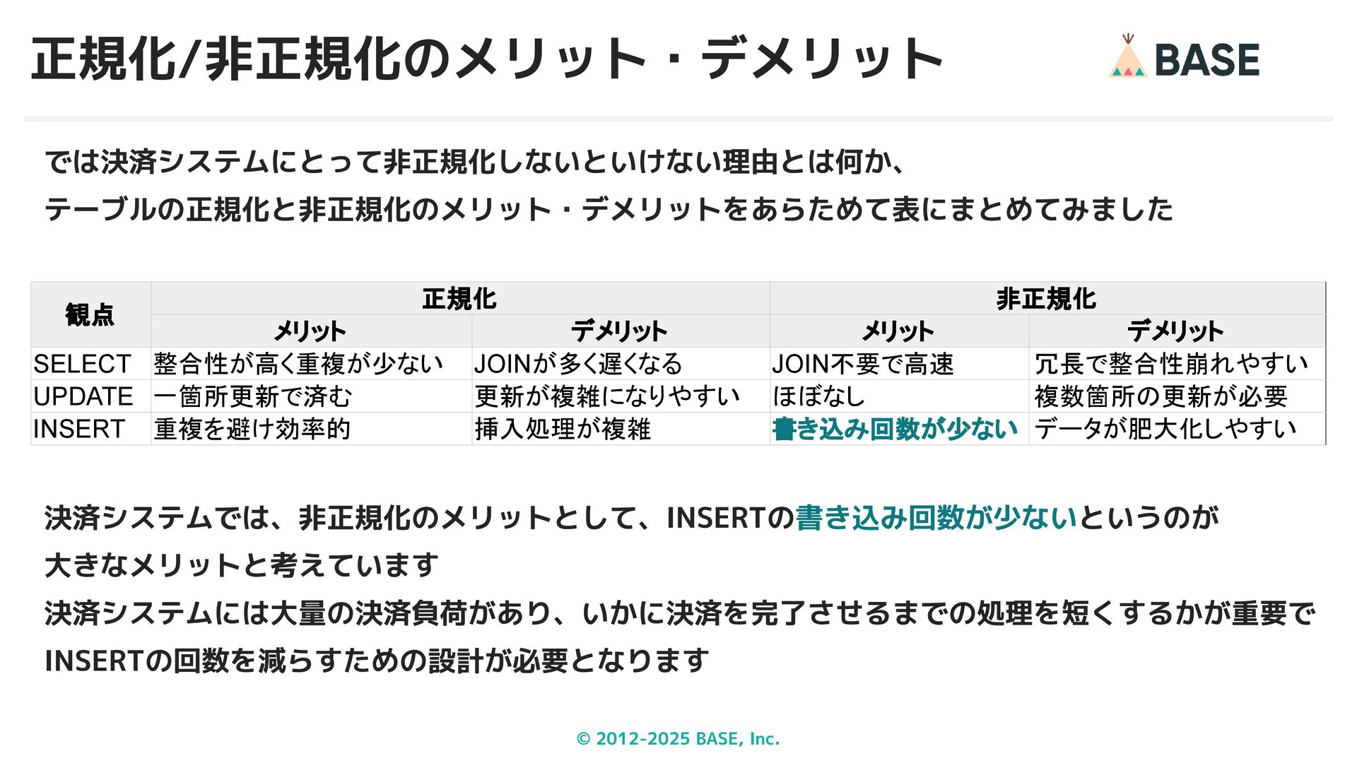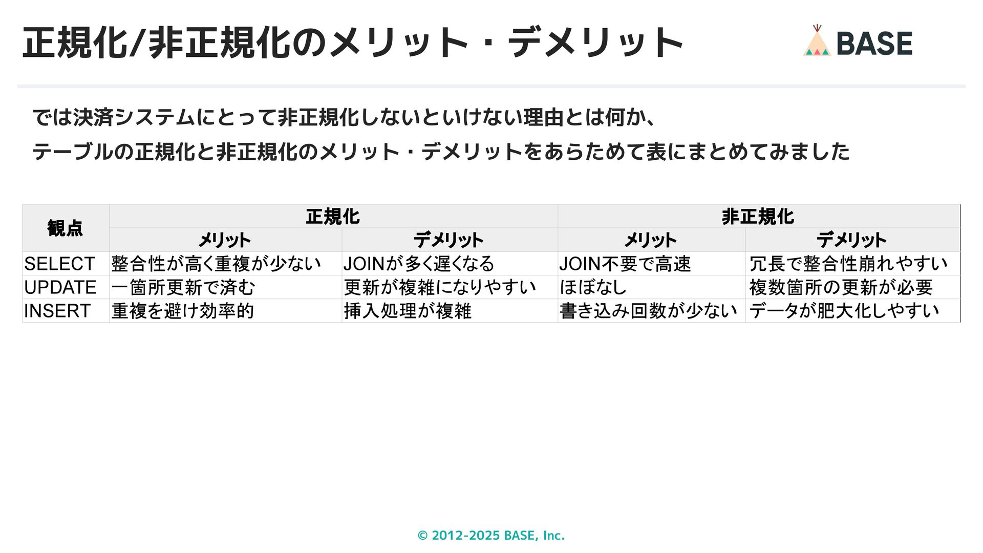 © 2012-2025 BASE, Inc. 正規化/非正規化のメリット・デメリット 15 では決済システムにとって非正規化しないといけない理由とは何か、 テーブルの正規化と非正規化のメリット・デメリットをあらためて表にまとめてみました 観点 正規化