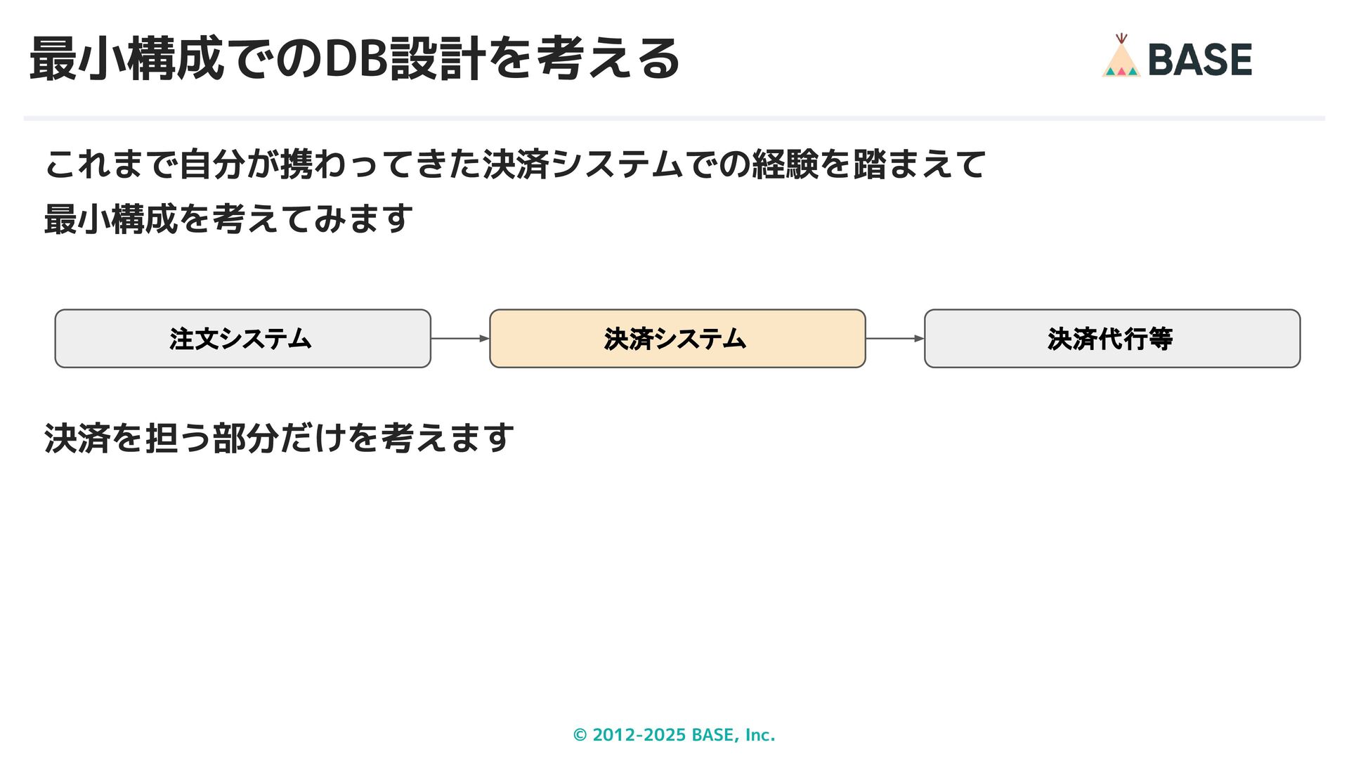 © 2012-2025 BASE, Inc. 最小構成でのDB設計を考える 17 これまで自分が携わってきた決済システムでの経験を踏まえて 最小構成を考えてみます 決済を担う部分だけを考えます 注文システム