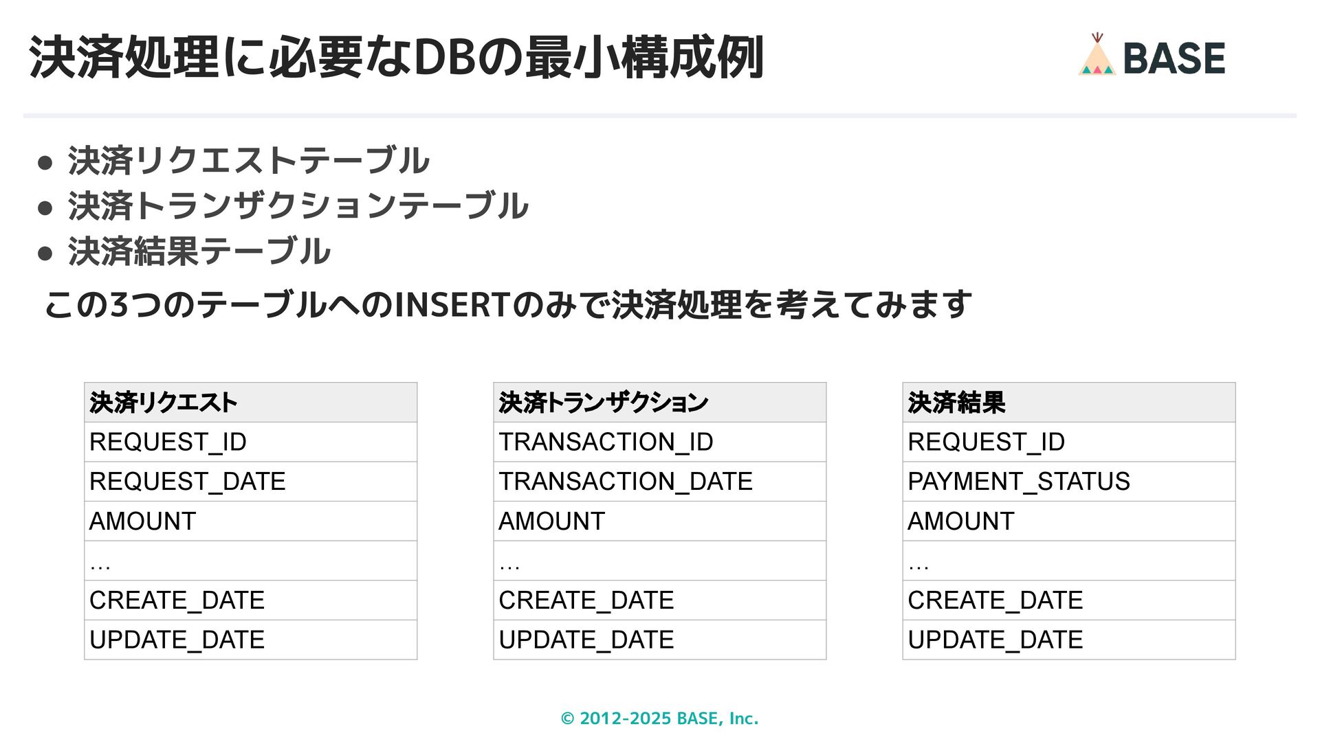 © 2012-2025 BASE, Inc. 決済処理に必要なDBの最小構成例 18 • 決済リクエストテーブル • 決済トランザクションテーブル