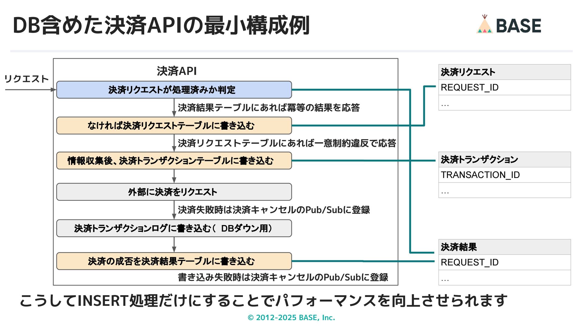 © 2012-2025 BASE, Inc. DB含めた決済APIの最小構成例 19 こうしてINSERT処理だけにすることでパフォーマンスを向上させられます 決済リクエスト REQUEST_ID …
