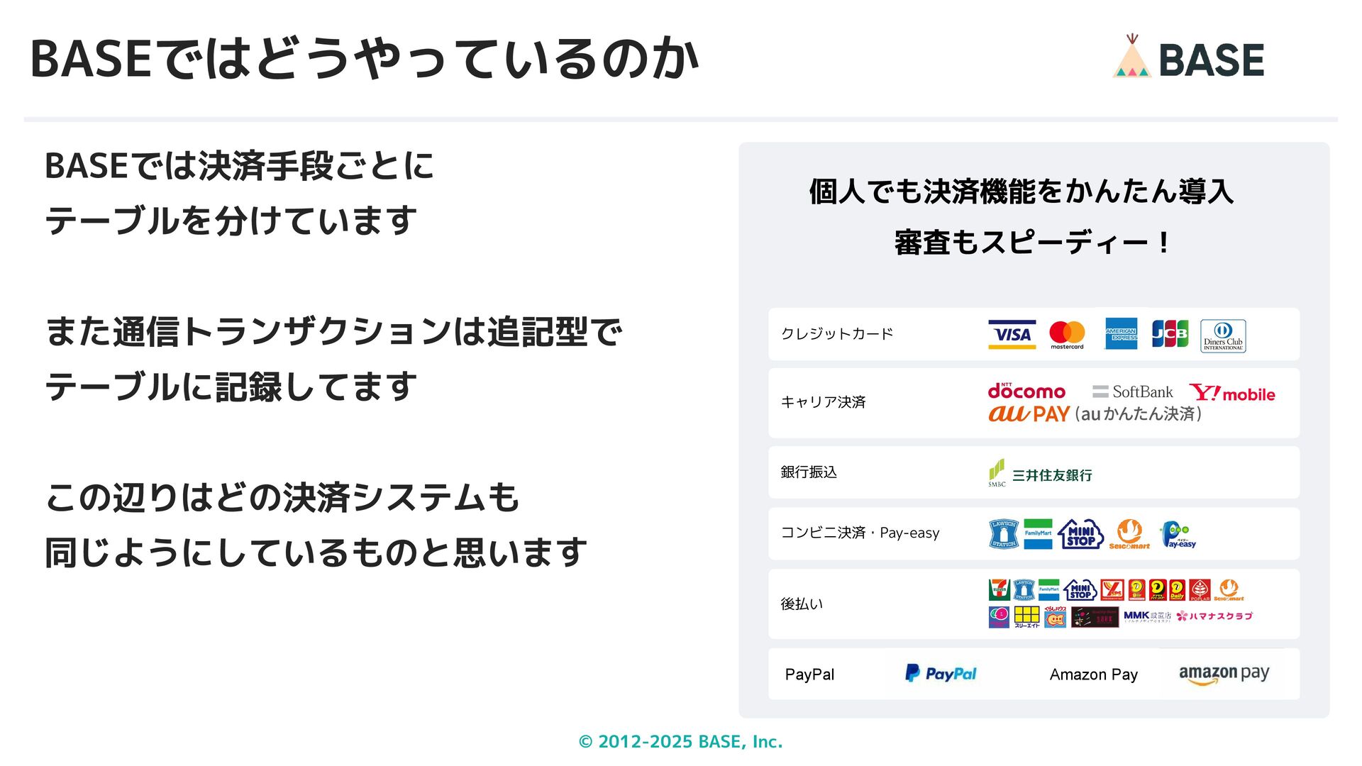 © 2012-2025 BASE, Inc. BASEではどうやっているのか 20 BASEでは決済手段ごとに テーブルを分けています また通信トランザクションは追記型で テーブルに記録してます