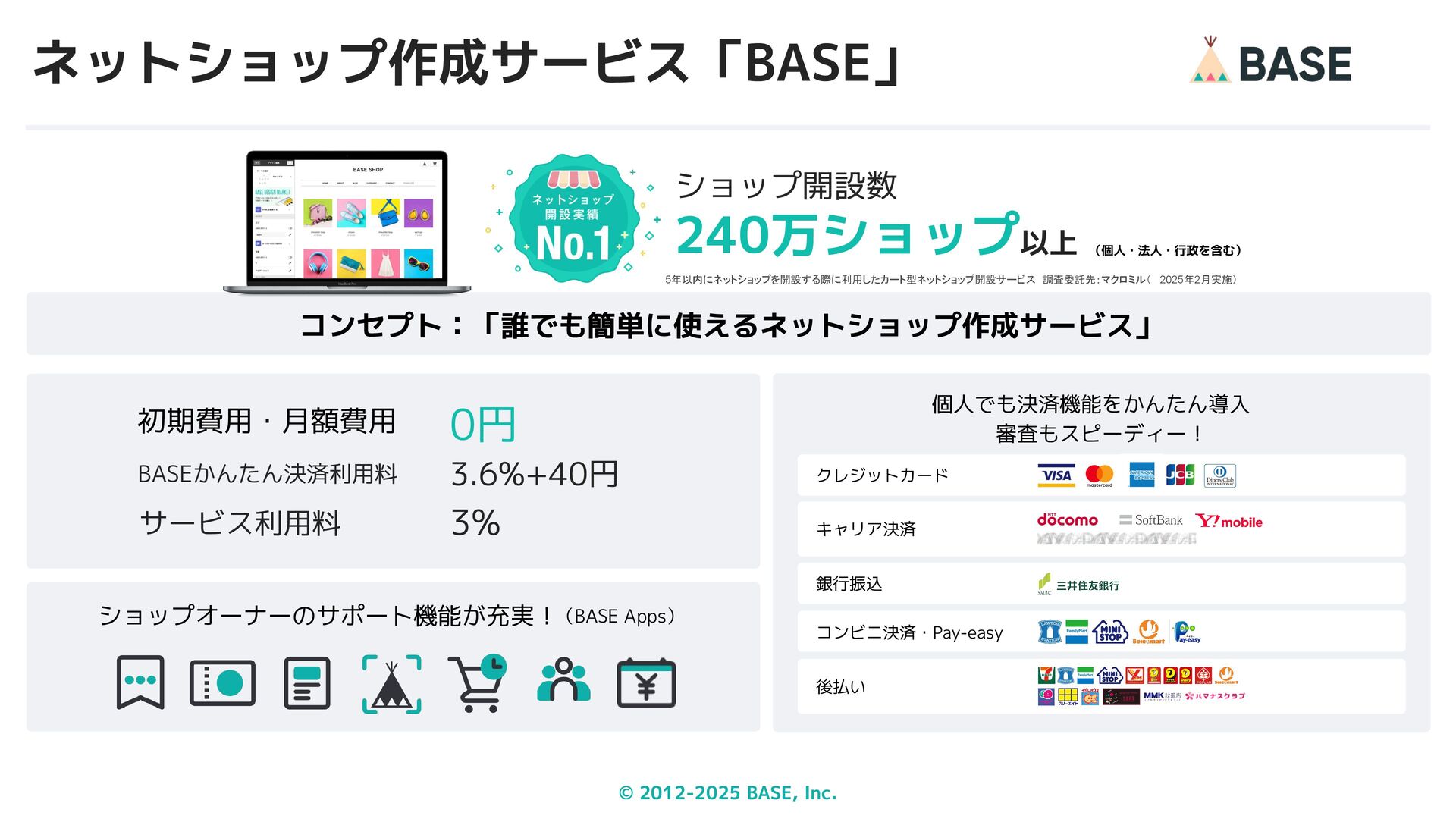 © 2012-2025 BASE, Inc. ネットショップ作成サービス「BASE」 3 ショップ開設数 (個人・法人・行政を含む) 240万ショップ以上 BASEかんたん決済利用料