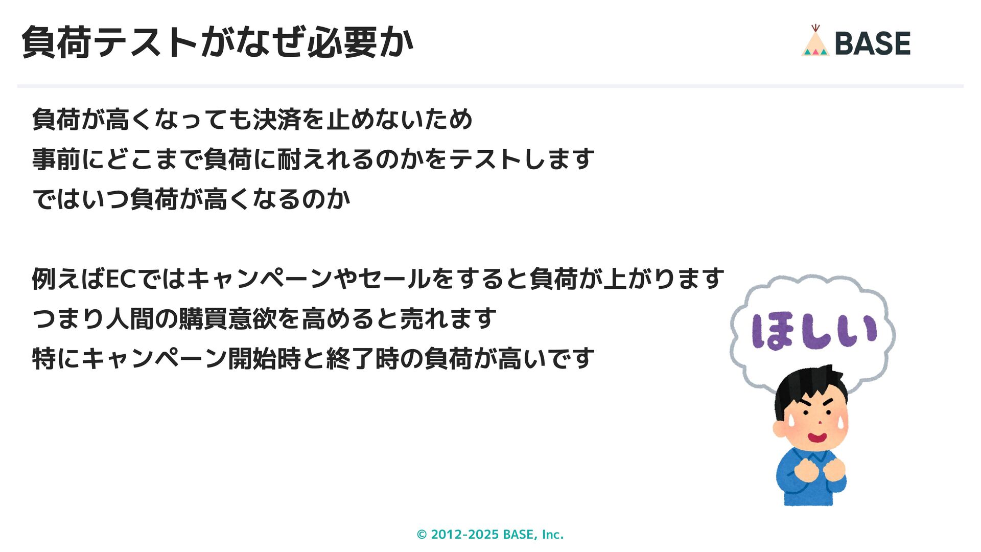 © 2012-2025 BASE, Inc. 負荷テストがなぜ必要か 22 負荷が高くなっても決済を止めないため 事前にどこまで負荷に耐えれるのかをテストします ではいつ負荷が高くなるのか 例えばECではキャンペーンやセールをすると負荷が上がります