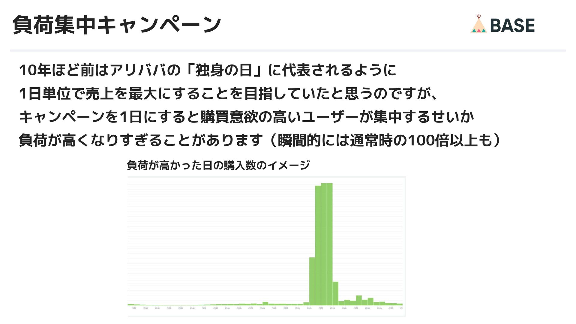 © 2012-2025 BASE, Inc. 負荷集中キャンペーン 23 10年ほど前はアリババの「独身の日」に代表されるように 1日単位で売上を最大にすることを目指していたと思うのですが、 キャンペーンを1日にすると購買意欲の高いユーザーが集中するせいか 負荷が高くなりすぎることがあります(瞬間的には通常時の100倍以上も)
