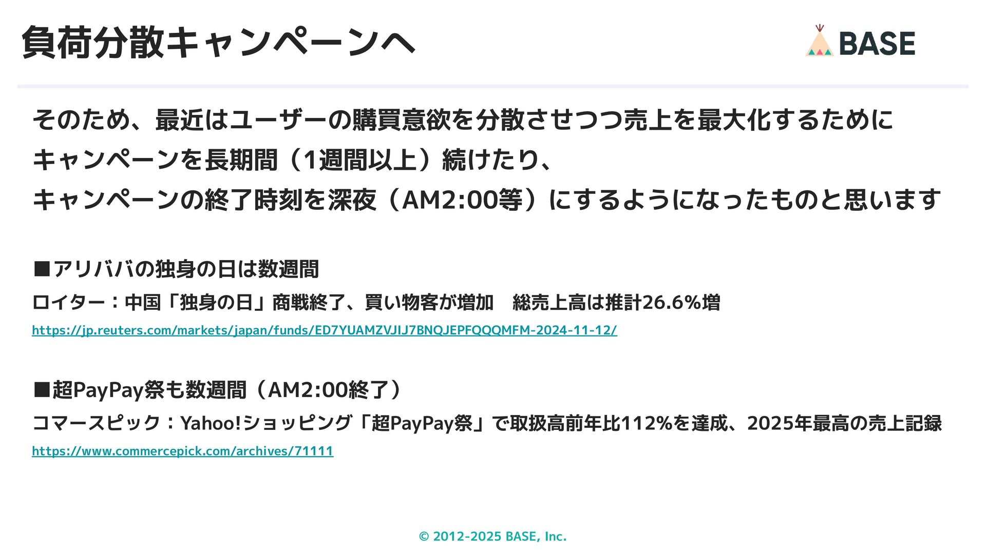 © 2012-2025 BASE, Inc. 負荷分散キャンペーンへ 24 そのため、最近はユーザーの購買意欲を分散させつつ売上を最大化するために キャンペーンを長期間(1週間以上)続けたり、 キャンペーンの終了時刻を深夜(AM2:00等)にするようになったものと思います ▪アリババの独身の日は数週間