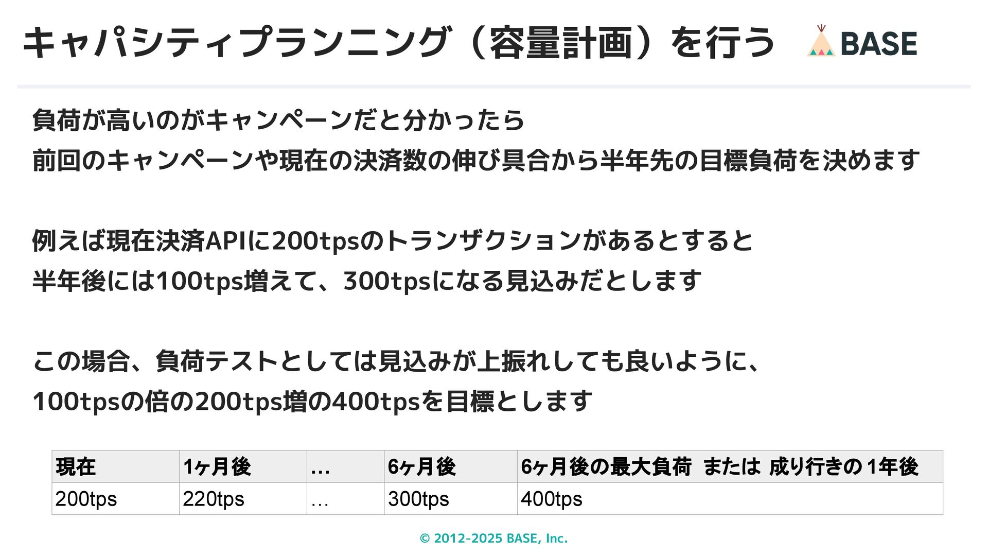 © 2012-2025 BASE, Inc. キャパシティプランニング(容量計画)を行う 25 負荷が高いのがキャンペーンだと分かったら 前回のキャンペーンや現在の決済数の伸び具合から半年先の目標負荷を決めます 例えば現在決済APIに200tpsのトランザクションがあるとすると 半年後には100tps増えて、300tpsになる見込みだとします