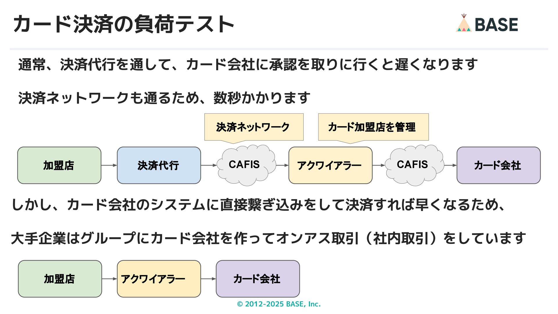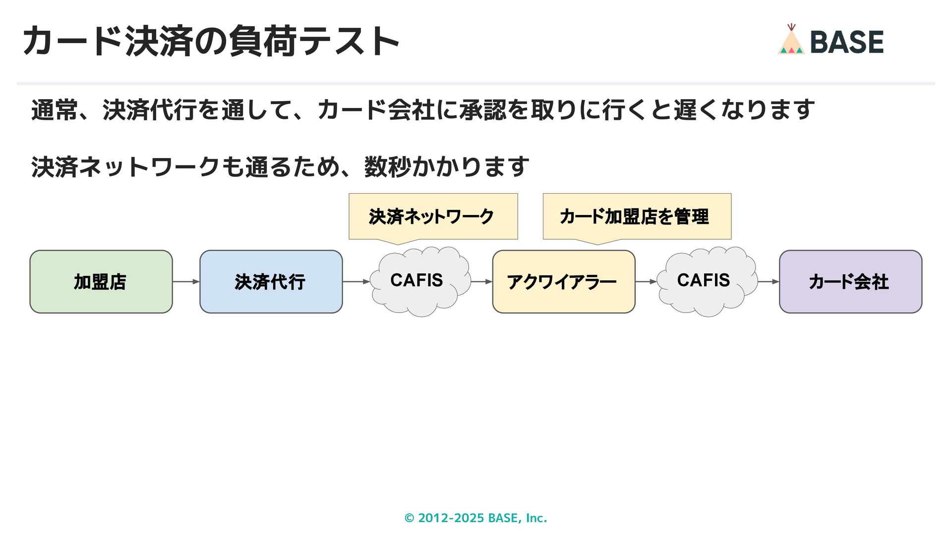 © 2012-2025 BASE, Inc. カード決済の負荷テスト 26 通常、決済代行を通して、カード会社に承認を取りに行くと遅くなります 決済ネットワークも通るため、数秒かかります アクワイアラー 決済代行