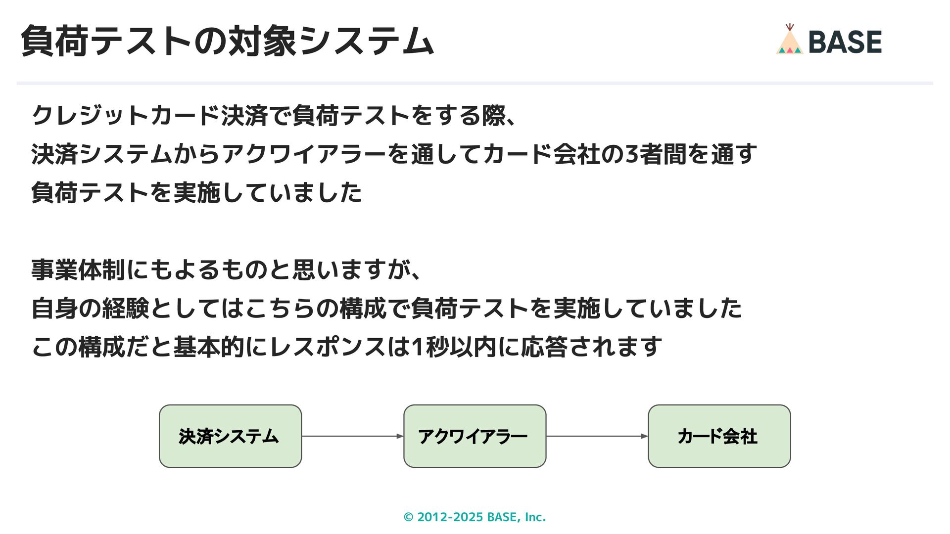 © 2012-2025 BASE, Inc. 負荷テストの対象システム 28 クレジットカード決済で負荷テストをする際、 決済システムからアクワイアラーを通してカード会社の3者間を通す 負荷テストを実施していました 事業体制にもよるものと思いますが、