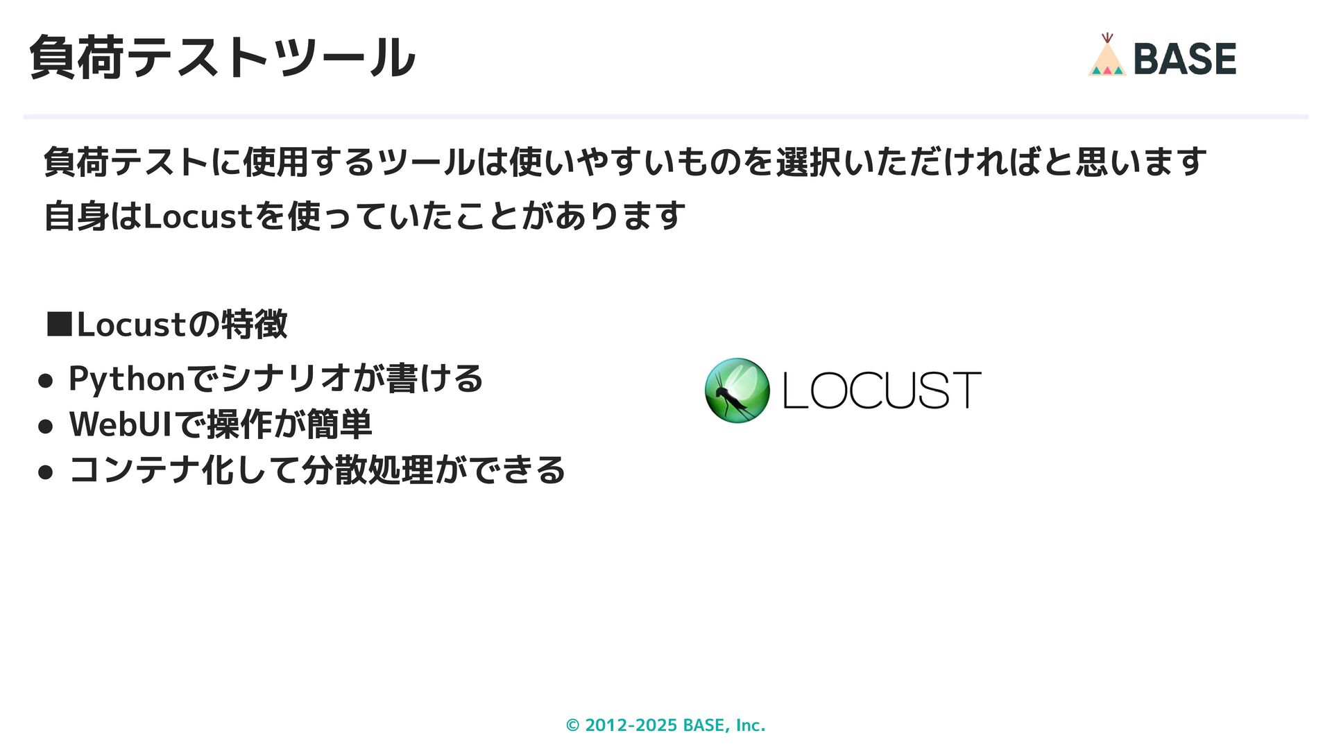 © 2012-2025 BASE, Inc. 負荷テストツール 29 負荷テストに使用するツールは使いやすいものを選択いただければと思います 自身はLocustを使っていたことがあります ▪Locustの特徴 •