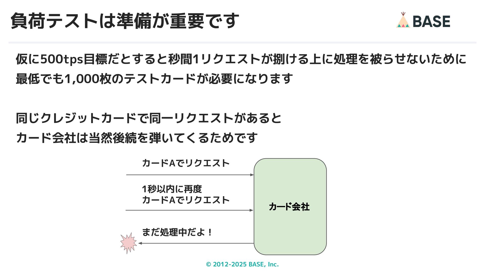 © 2012-2025 BASE, Inc. 負荷テストは準備が重要です 30 仮に500tps目標だとすると秒間1リクエストが捌ける上に処理を被らせないために 最低でも1,000枚のテストカードが必要になります 同じクレジットカードで同一リクエストがあると カード会社は当然後続を弾いてくるためです