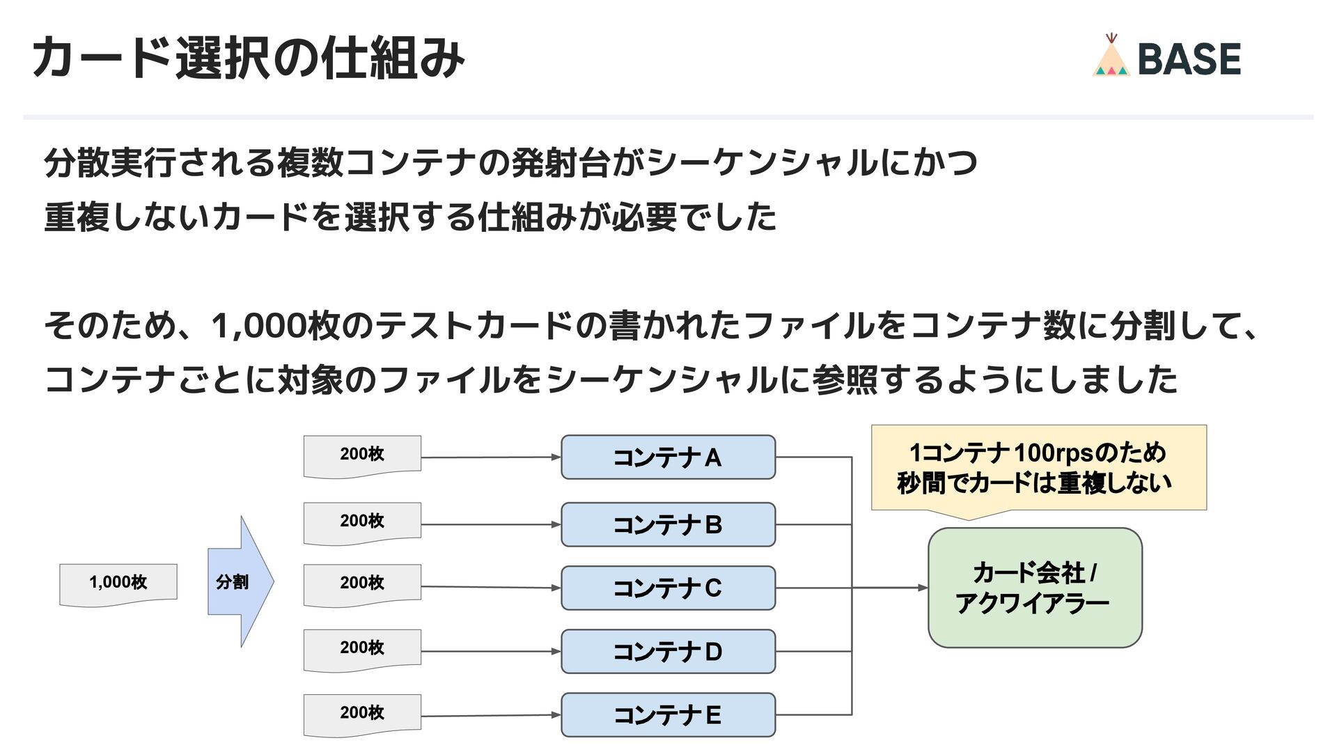 カード会社 / アクワイアラー 1,000枚 200枚 200枚 200枚 200枚 200枚 コンテナA コンテナB コンテナC コンテナD コンテナE 分割 1コンテナ100rpsのため 秒間でカードは重複しない