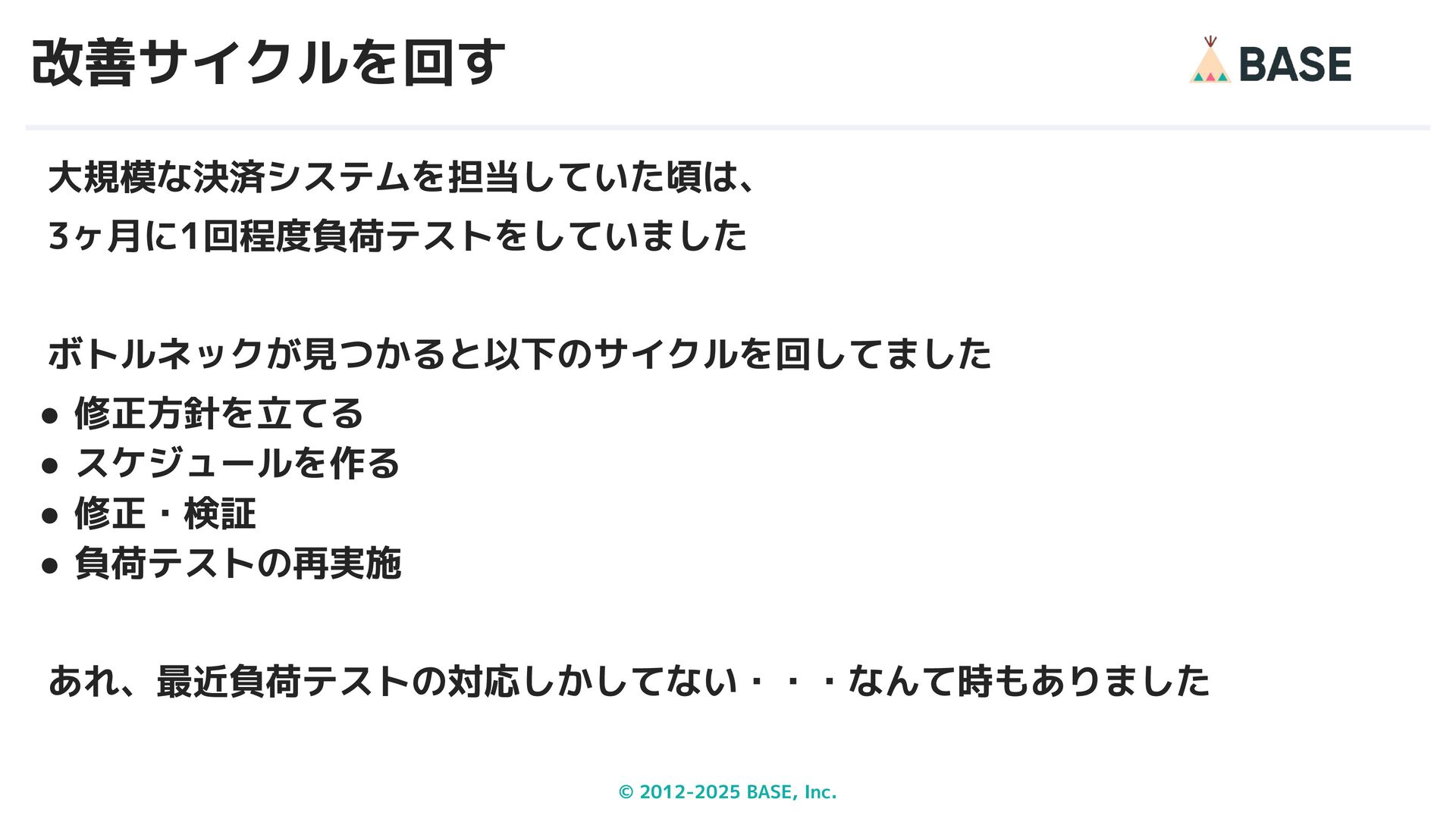 © 2012-2025 BASE, Inc. 改善サイクルを回す 32 大規模な決済システムを担当していた頃は、 3ヶ月に1回程度負荷テストをしていました ボトルネックが見つかると以下のサイクルを回してました •