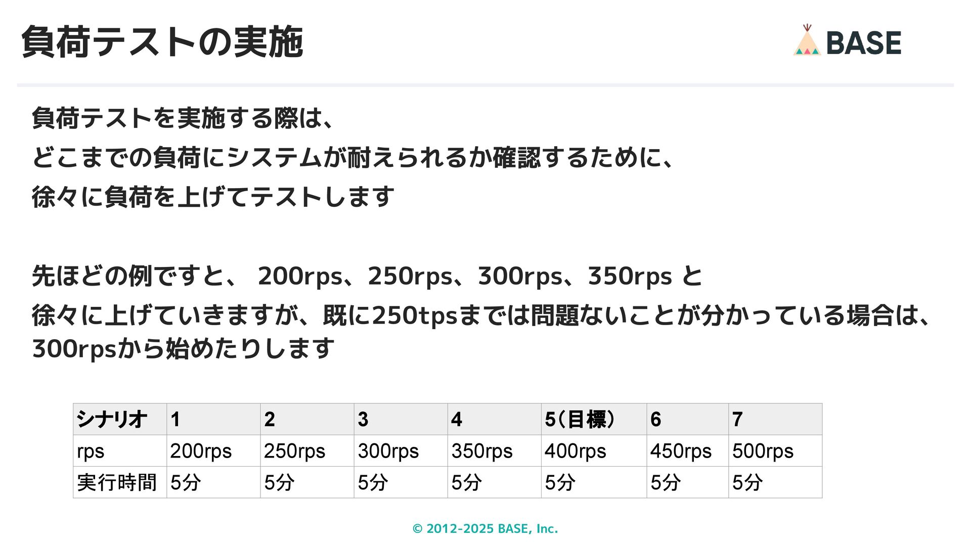 © 2012-2025 BASE, Inc. 負荷テストの実施 33 負荷テストを実施する際は、 どこまでの負荷にシステムが耐えられるか確認するために、 徐々に負荷を上げてテストします 先ほどの例ですと、