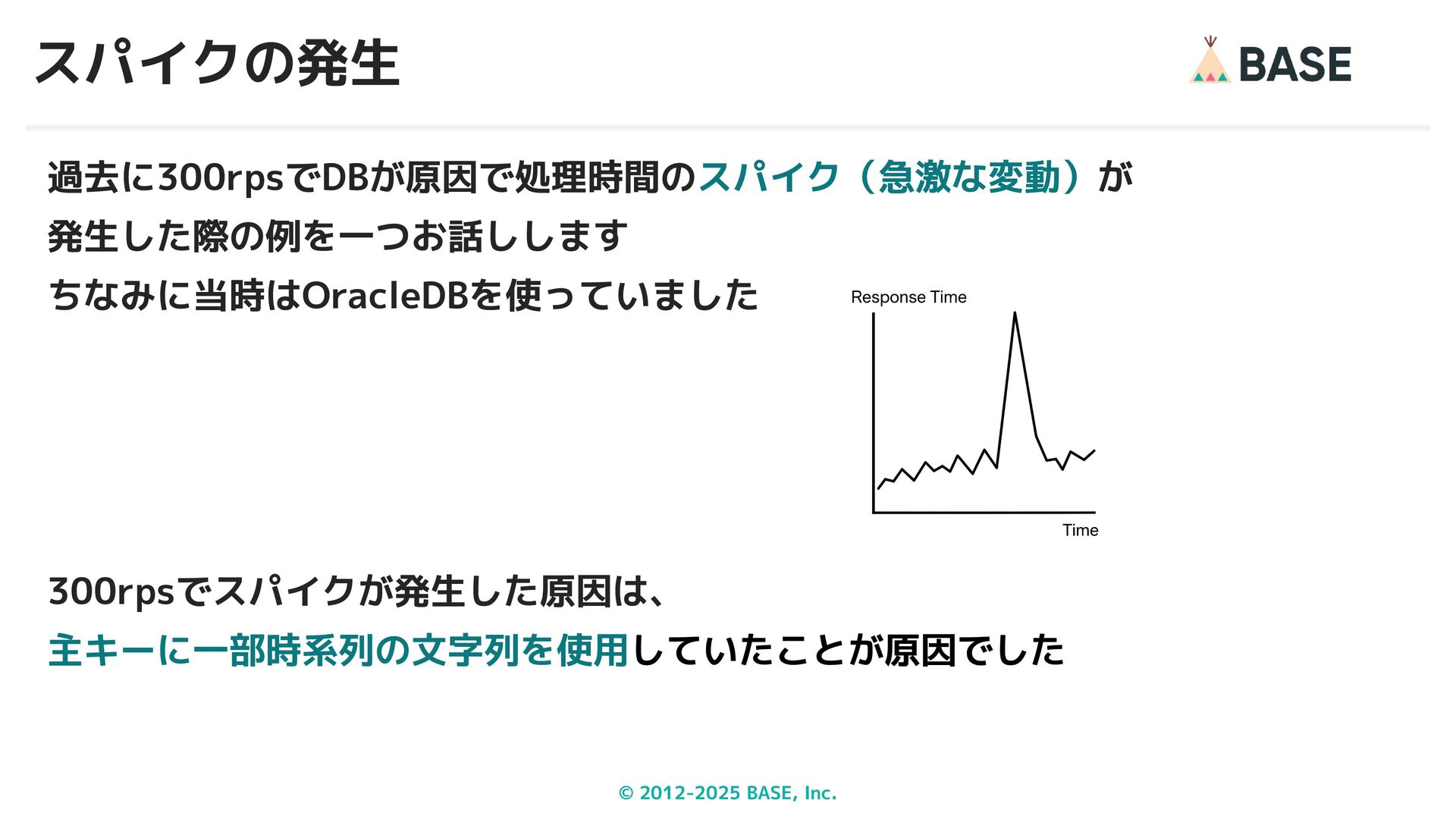 © 2012-2025 BASE, Inc. スパイクの発生 34 過去に300rpsでDBが原因で処理時間のスパイク(急激な変動)が 発生した際の例を一つお話しします ちなみに当時はOracleDBを使っていました 300rpsでスパイクが発生した原因は、
