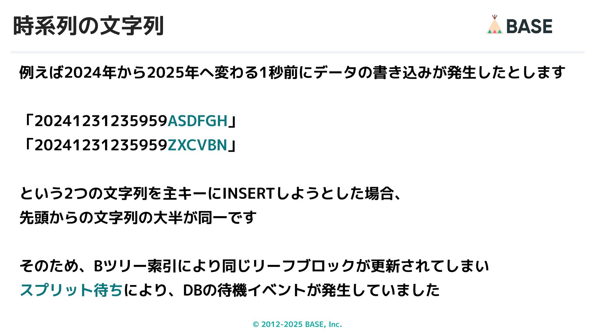© 2012-2025 BASE, Inc. 時系列の文字列 35 例えば2024年から2025年へ変わる1秒前にデータの書き込みが発生したとします 「20241231235959ASDFGH」 「20241231235959ZXCVBN」 という2つの文字列を主キーにINSERTしようとした場合、