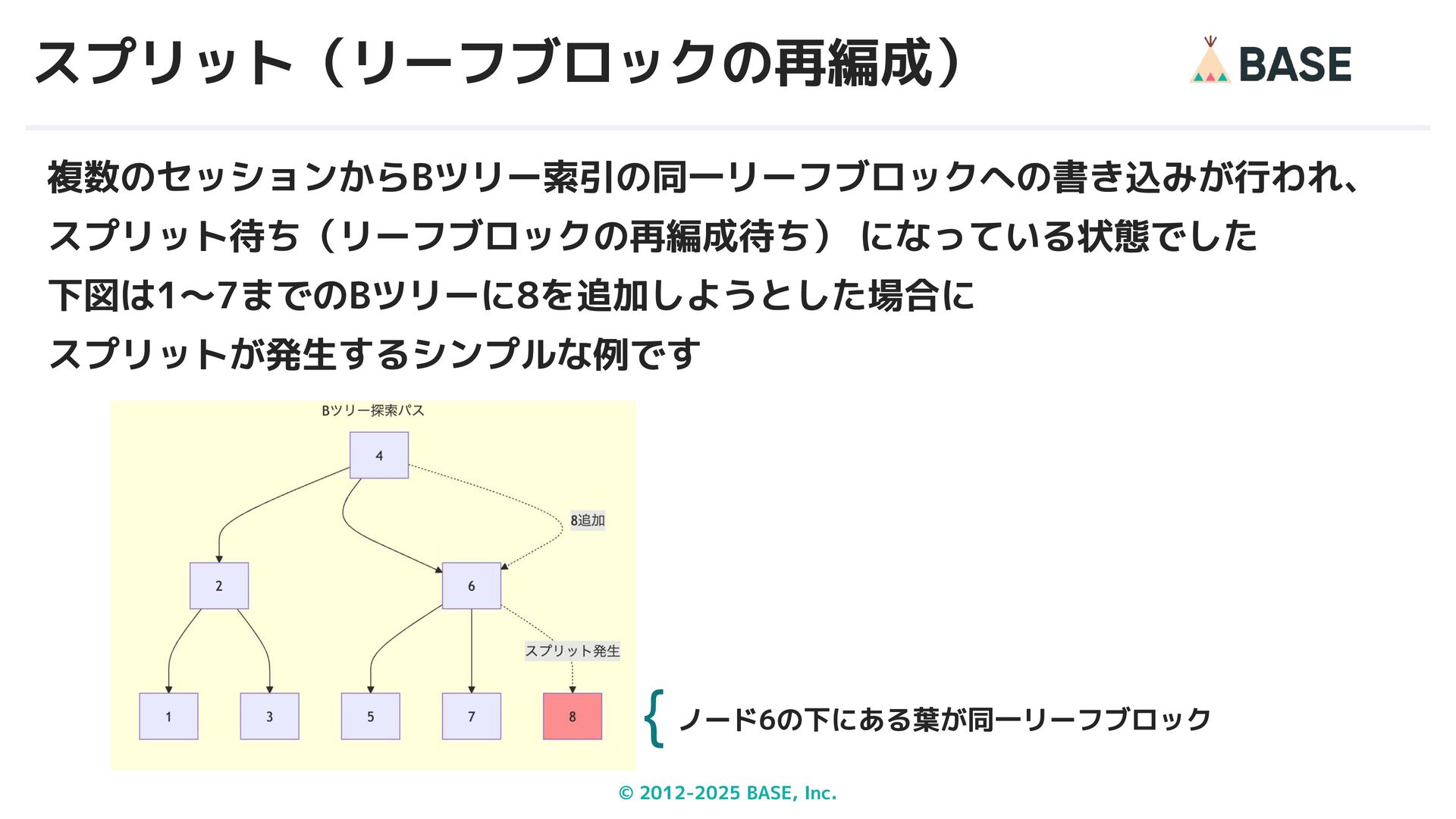 © 2012-2025 BASE, Inc. スプリット(リーフブロックの再編成) 36 複数のセッションからBツリー索引の同一リーフブロックへの書き込みが行われ、 スプリット待ち(リーフブロックの再編成待ち) になっている状態でした 下図は1〜7までのBツリーに8を追加しようとした場合に