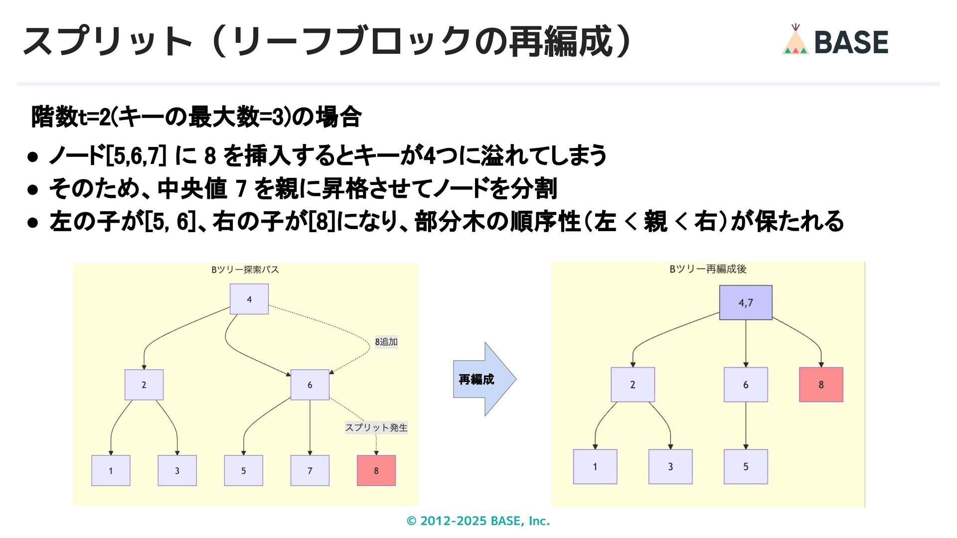 © 2012-2025 BASE, Inc. スプリット(リーフブロックの再編成) 37 階数t=2(キーの最大数=3)の場合 • ノード[5,6,7]