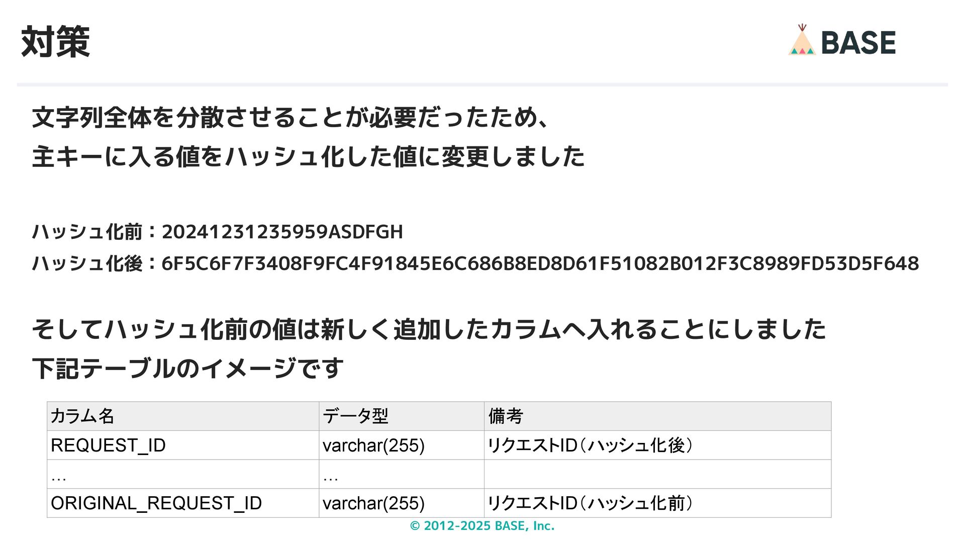 © 2012-2025 BASE, Inc. 対策 38 文字列全体を分散させることが必要だったため、 主キーに入る値をハッシュ化した値に変更しました ハッシュ化前:20241231235959ASDFGH ハッシュ化後:6F5C6F7F3408F9FC4F91845E6C686B8ED8D61F51082B012F3C8989FD53D5F648