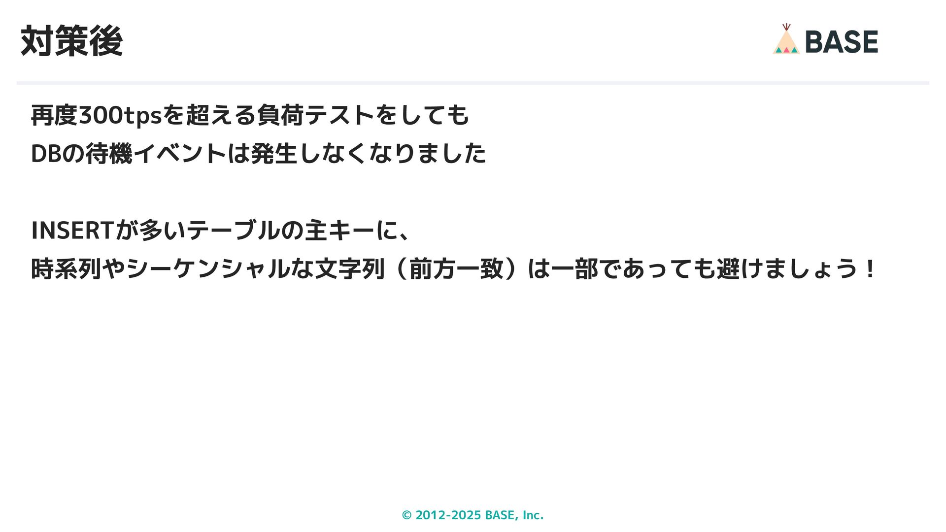 © 2012-2025 BASE, Inc. 対策後 39 再度300tpsを超える負荷テストをしても DBの待機イベントは発生しなくなりました INSERTが多いテーブルの主キーに、 時系列やシーケンシャルな文字列(前方一致)は一部であっても避けましょう!