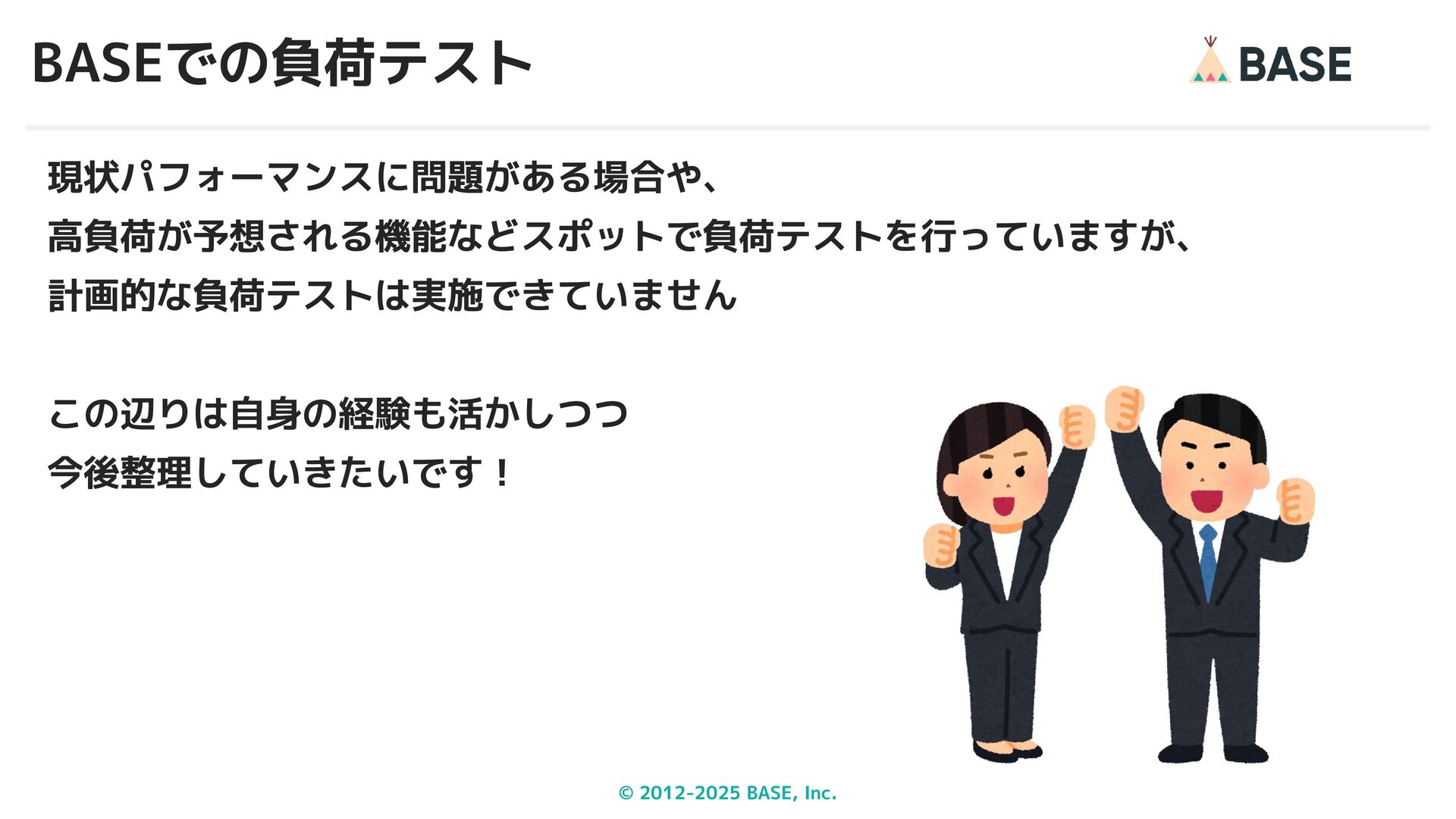 © 2012-2025 BASE, Inc. BASEでの負荷テスト 40 現状パフォーマンスに問題がある場合や、 高負荷が予想される機能などスポットで負荷テストを行っていますが、 計画的な負荷テストは実施できていません この辺りは自身の経験も活かしつつ