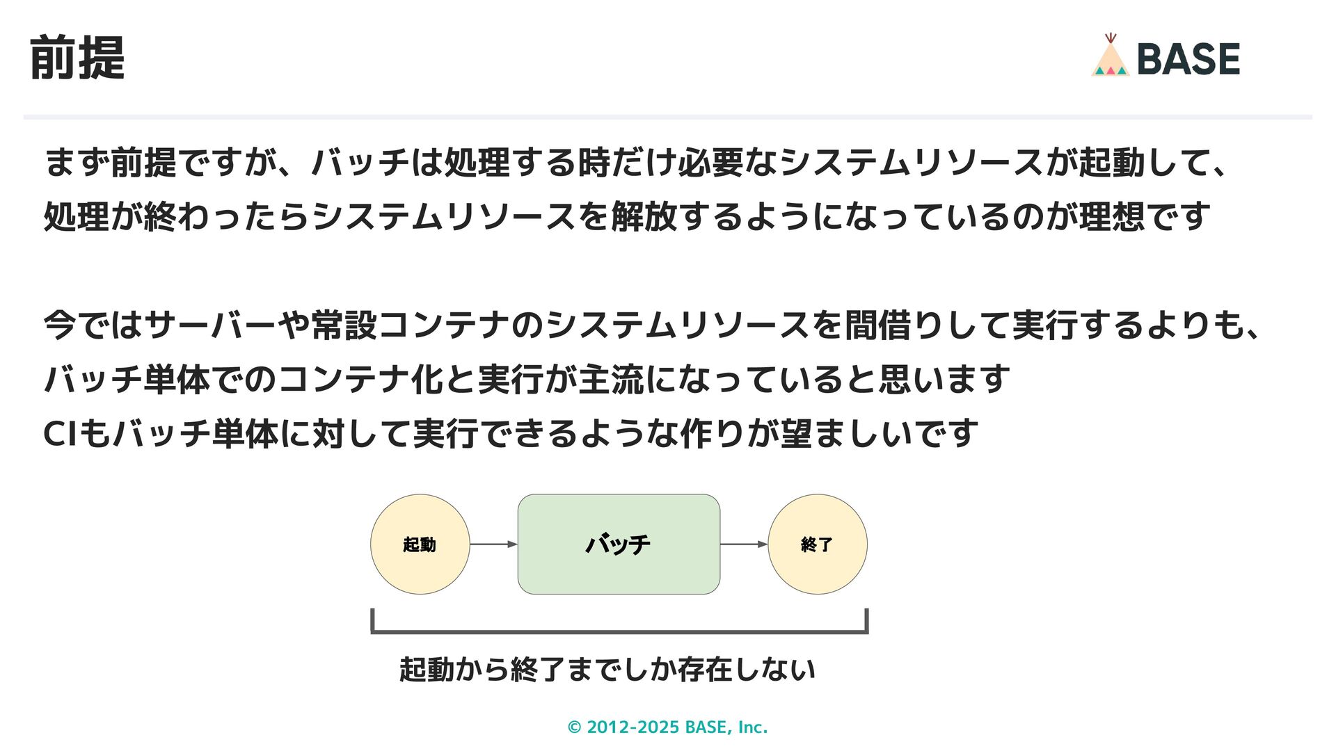 © 2012-2025 BASE, Inc. 前提 42 まず前提ですが、バッチは処理する時だけ必要なシステムリソースが起動して、 処理が終わったらシステムリソースを解放するようになっているのが理想です 今ではサーバーや常設コンテナのシステムリソースを間借りして実行するよりも、 バッチ単体でのコンテナ化と実行が主流になっていると思います