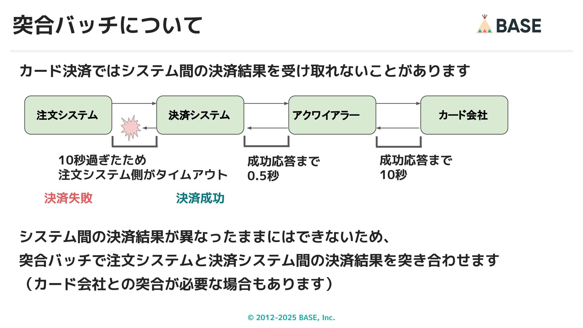 © 2012-2025 BASE, Inc. 突合バッチについて 43 カード決済ではシステム間の決済結果を受け取れないことがあります システム間の決済結果が異なったままにはできないため、 突合バッチで注文システムと決済システム間の決済結果を突き合わせます (カード会社との突合が必要な場合もあります)