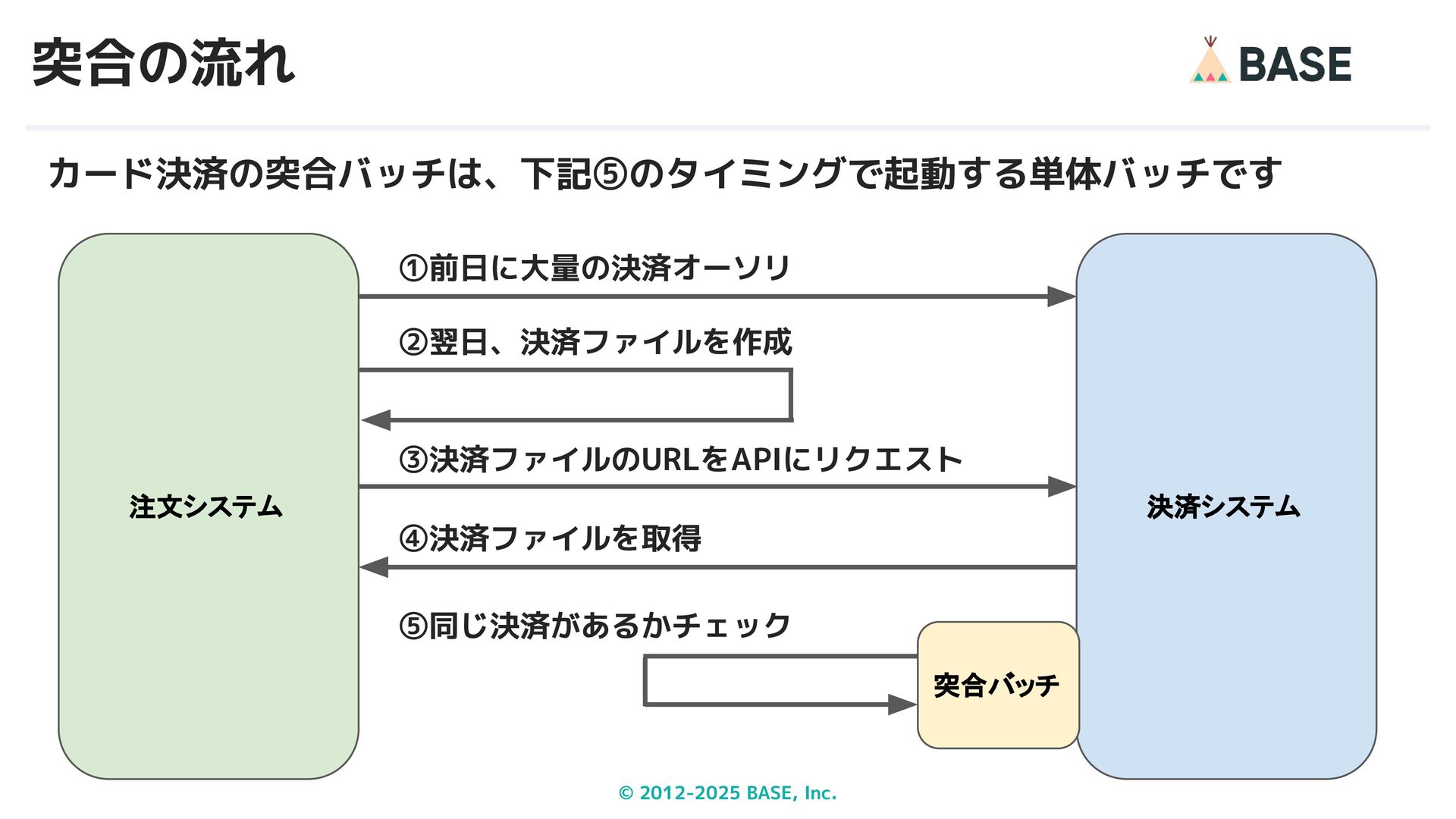 © 2012-2025 BASE, Inc. 突合の流れ 44 カード決済の突合バッチは、下記⑤のタイミングで起動する単体バッチです 注文システム 決済システム ①前日に大量の決済オーソリ
