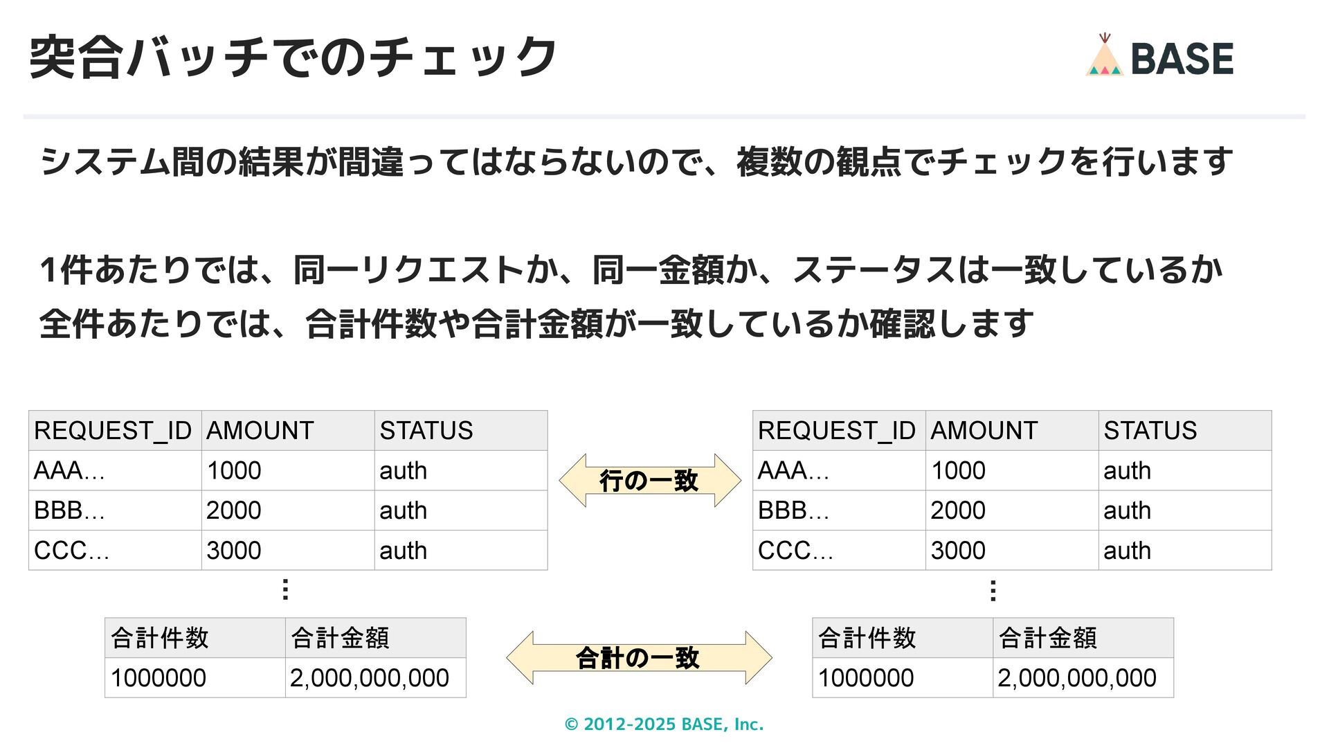 © 2012-2025 BASE, Inc. 突合バッチでのチェック 45 システム間の結果が間違ってはならないので、複数の観点でチェックを行います 1件あたりでは、同一リクエストか、同一金額か、ステータスは一致しているか 全件あたりでは、合計件数や合計金額が一致しているか確認します REQUEST_ID