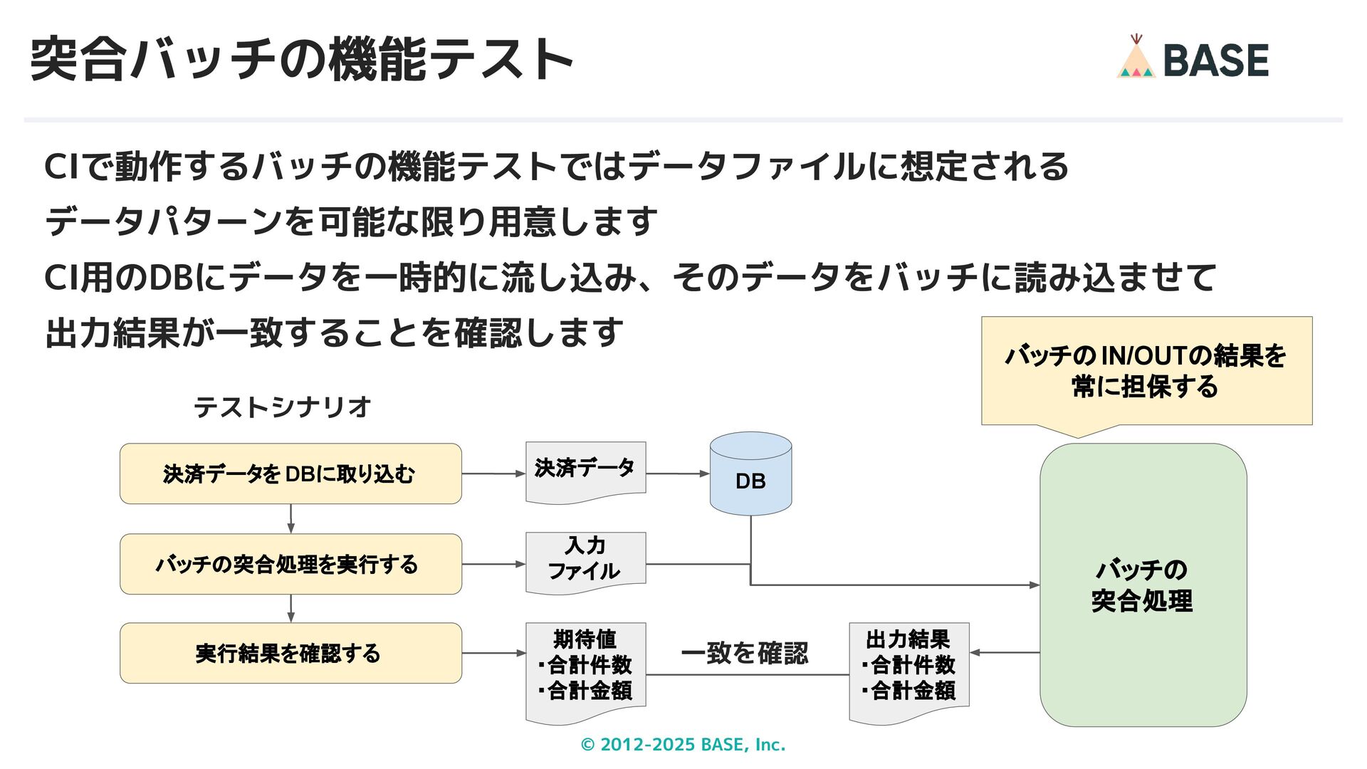 © 2012-2025 BASE, Inc. 突合バッチの機能テスト 46 CIで動作するバッチの機能テストではデータファイルに想定される データパターンを可能な限り用意します CI用のDBにデータを一時的に流し込み、そのデータをバッチに読み込ませて 出力結果が一致することを確認します
