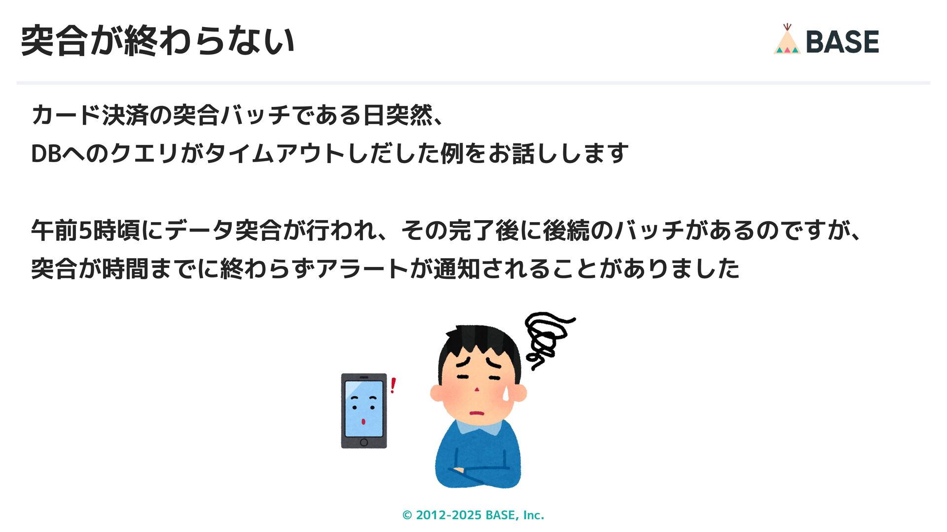 © 2012-2025 BASE, Inc. 突合が終わらない 47 カード決済の突合バッチである日突然、 DBへのクエリがタイムアウトしだした例をお話しします 午前5時頃にデータ突合が行われ、その完了後に後続のバッチがあるのですが、 突合が時間までに終わらずアラートが通知されることがありました