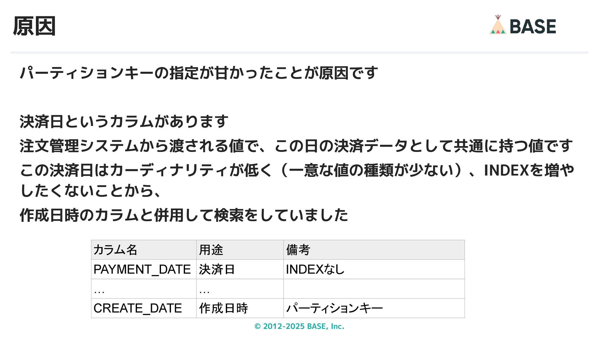 © 2012-2025 BASE, Inc. 原因 48 パーティションキーの指定が甘かったことが原因です 決済日というカラムがあります 注文管理システムから渡される値で、この日の決済データとして共通に持つ値です この決済日はカーディナリティが低く(一意な値の種類が少ない)、INDEXを増や