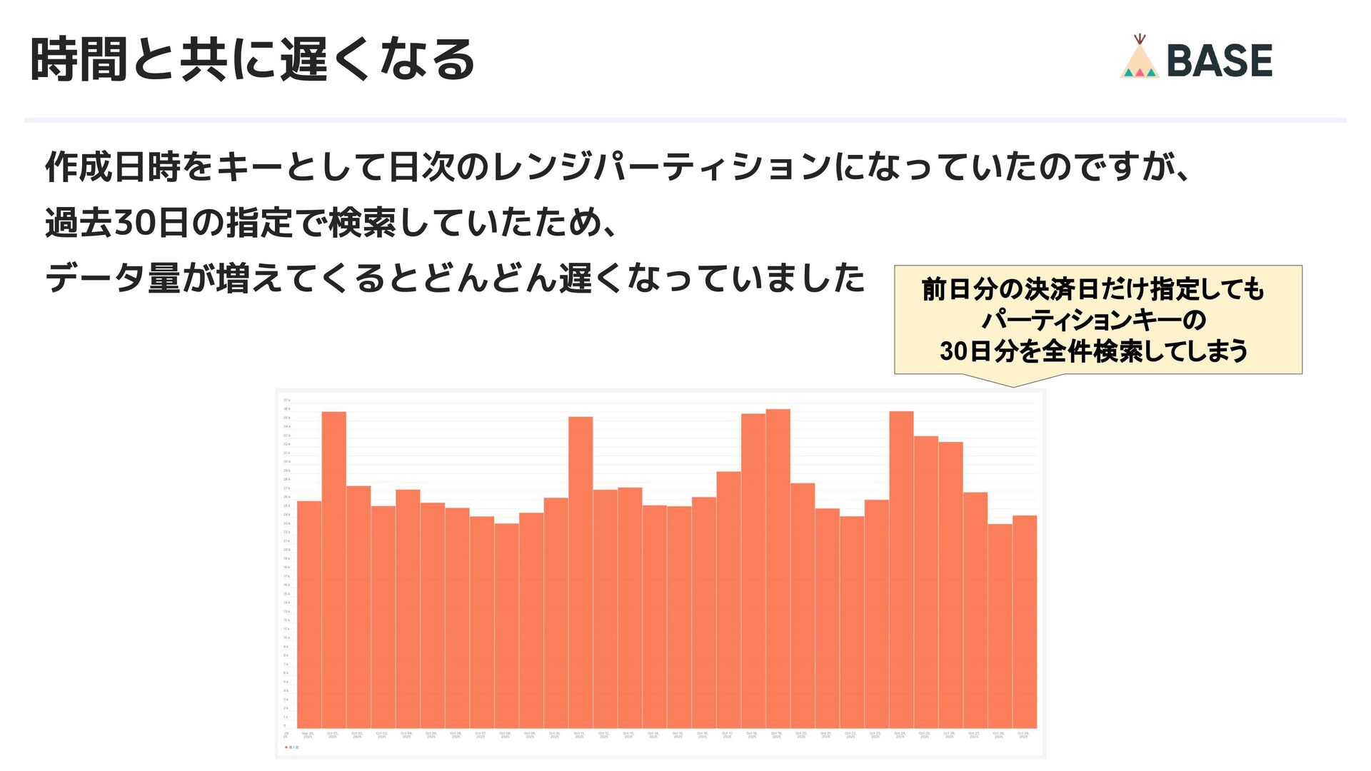 © 2012-2025 BASE, Inc. 時間と共に遅くなる 49 作成日時をキーとして日次のレンジパーティションになっていたのですが、 過去30日の指定で検索していたため、 データ量が増えてくるとどんどん遅くなっていました 前日分の決済日だけ指定しても