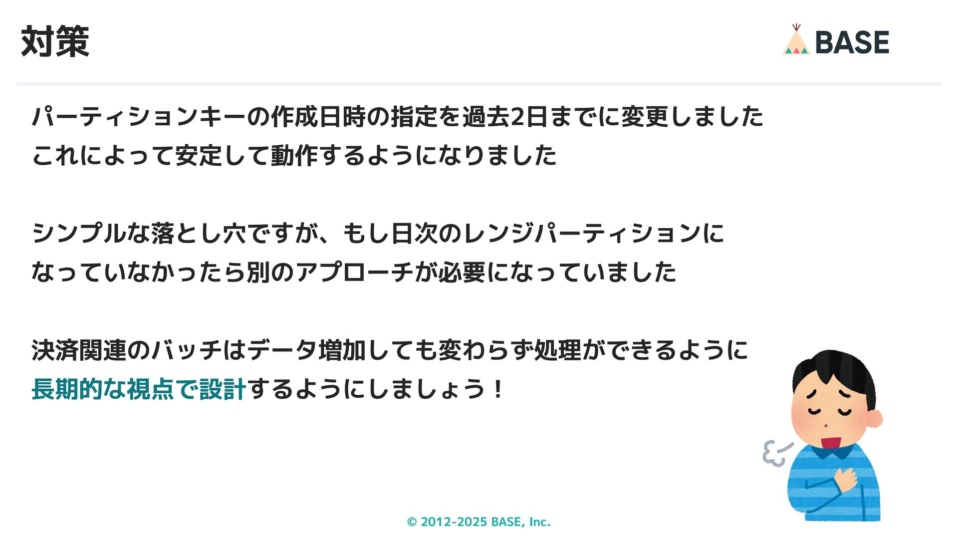 © 2012-2025 BASE, Inc. 対策 50 パーティションキーの作成日時の指定を過去2日までに変更しました これによって安定して動作するようになりました シンプルな落とし穴ですが、もし日次のレンジパーティションに なっていなかったら別のアプローチが必要になっていました