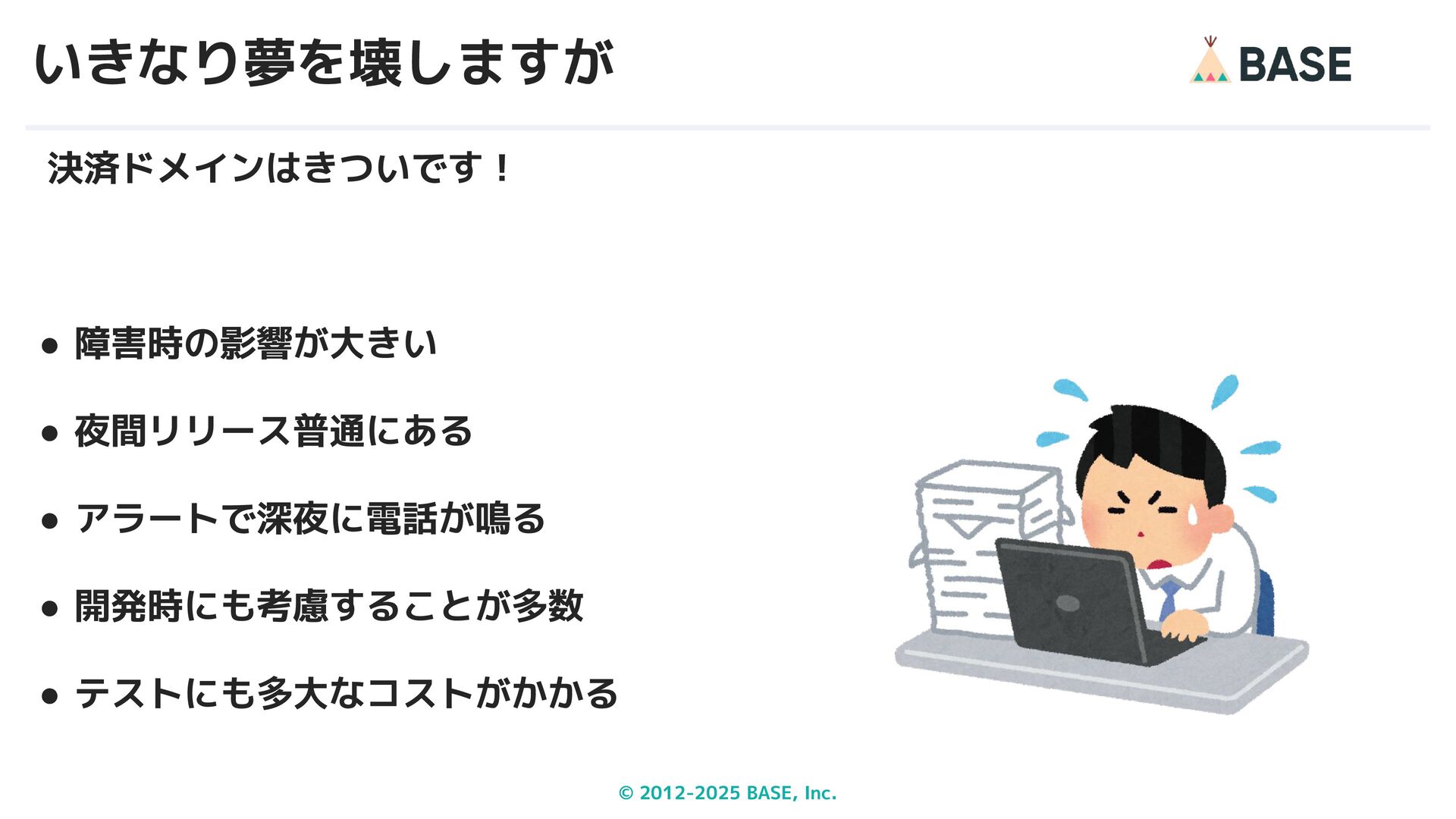 © 2012-2025 BASE, Inc. いきなり夢を壊しますが 6 決済ドメインはきついです! • 障害時の影響が大きい •