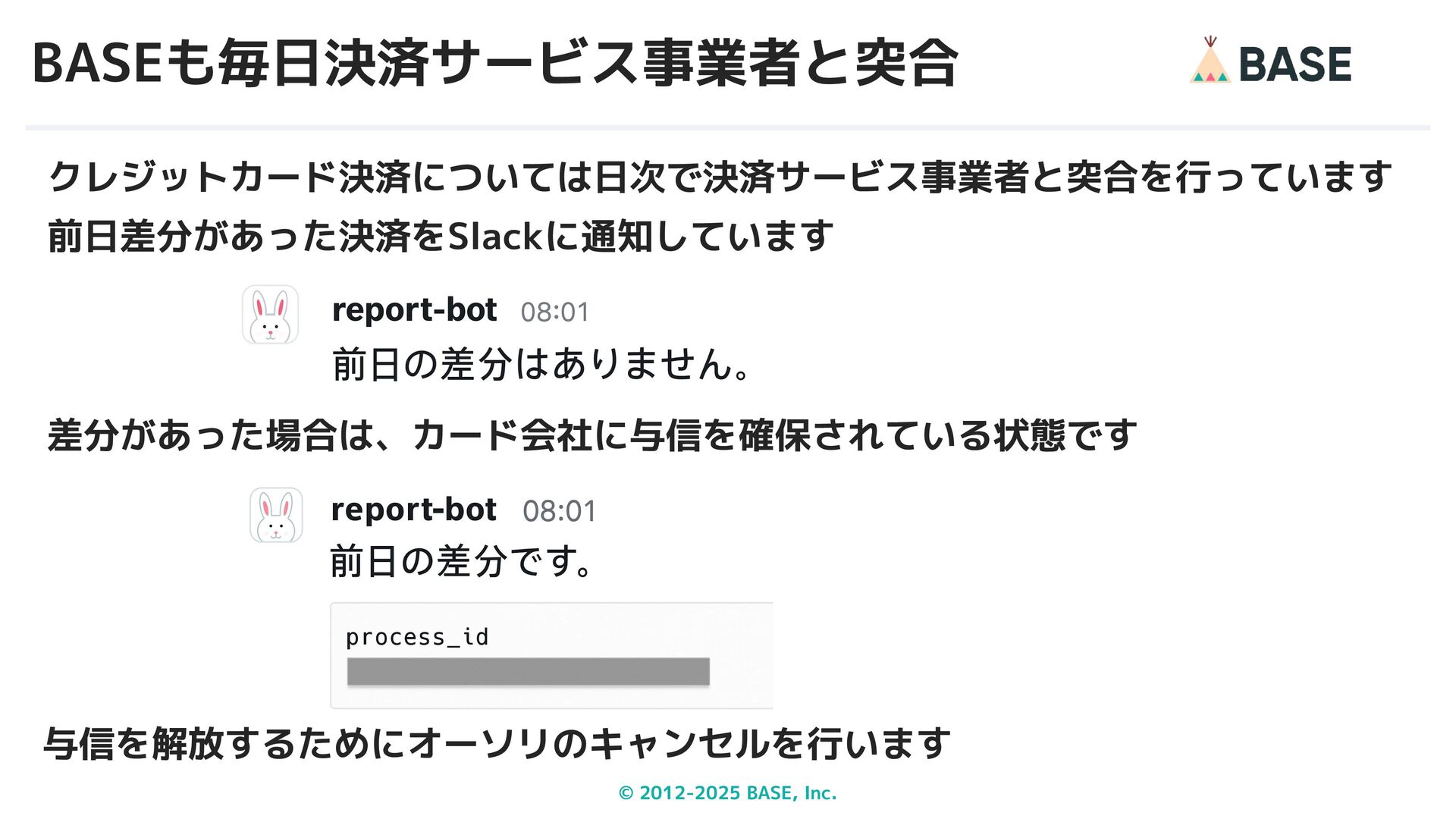 © 2012-2025 BASE, Inc. BASEも毎日決済サービス事業者と突合 51 クレジットカード決済については日次で決済サービス事業者と突合を行っています 前日差分があった決済をSlackに通知しています 差分があった場合は、カード会社に与信を確保されている状態です 与信を解放するためにオーソリのキャンセルを行います