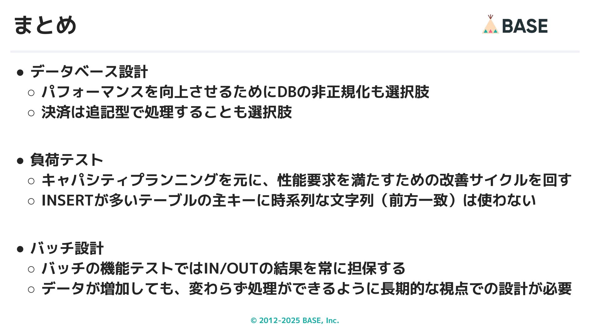 © 2012-2025 BASE, Inc. まとめ 53 • データベース設計 ◦ パフォーマンスを向上させるためにDBの非正規化も選択肢