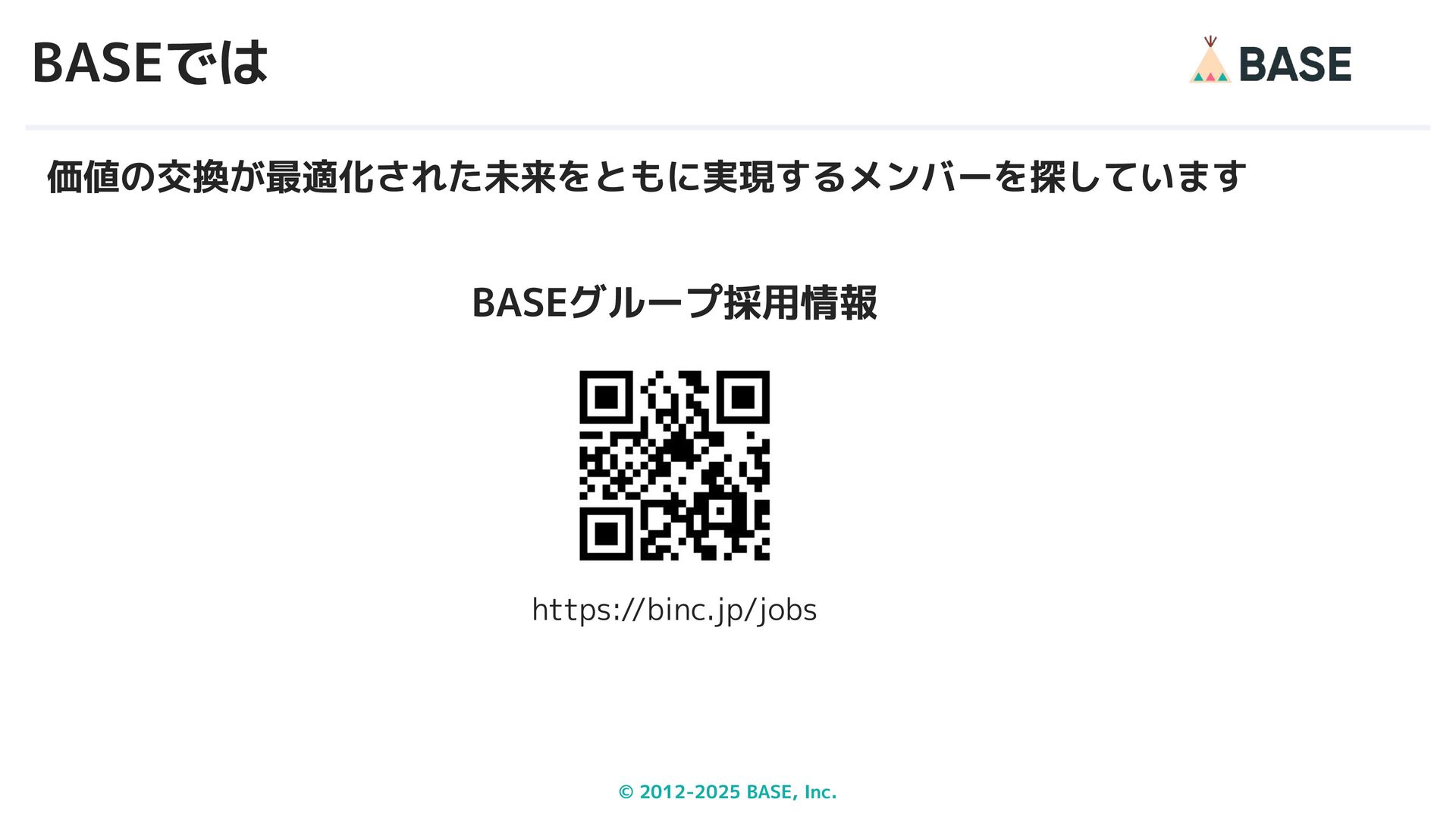 © 2012-2025 BASE, Inc. BASEでは 54 価値の交換が最適化された未来をともに実現するメンバーを探しています https://binc.jp/jobs BASEグループ採用情報
