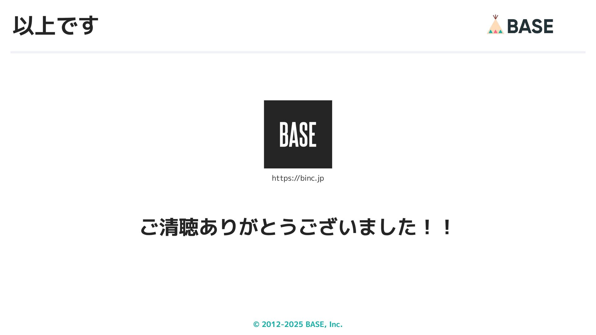 © 2012-2025 BASE, Inc. 以上です 55 ご清聴ありがとうございました!! https://binc.jp