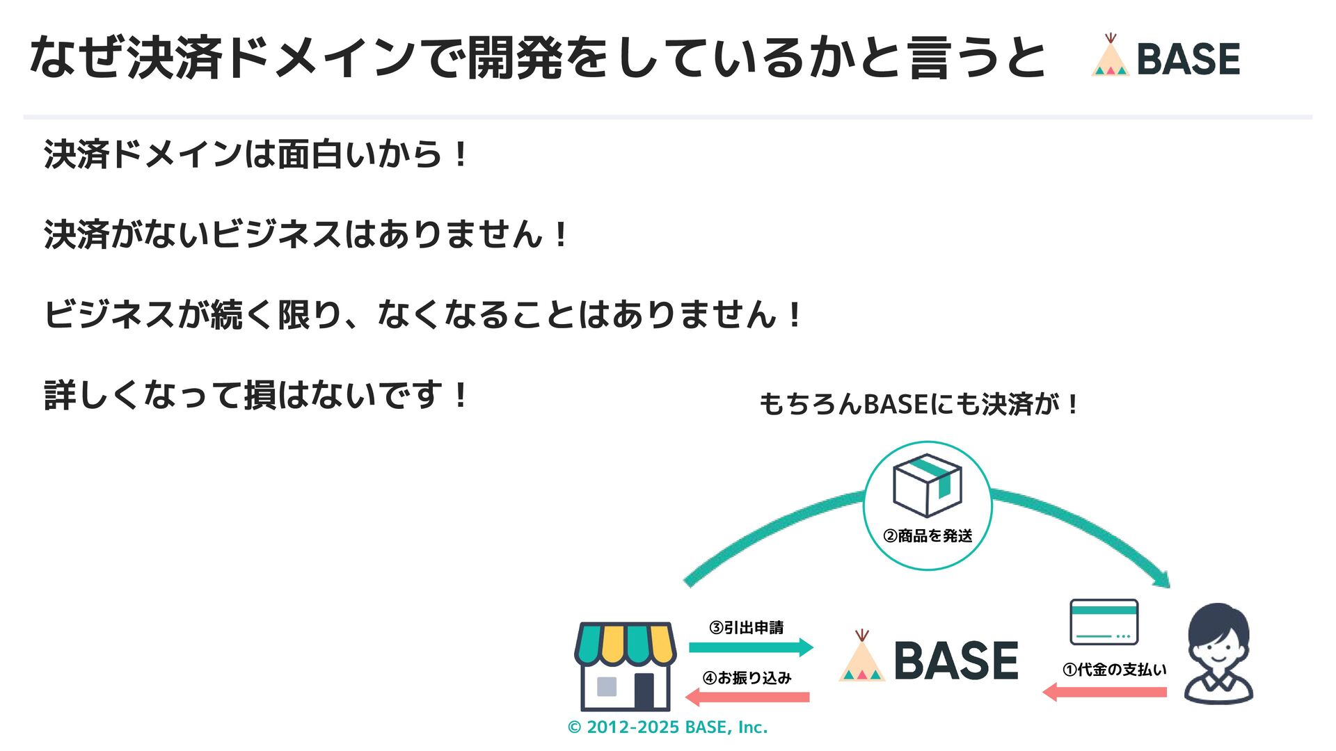 © 2012-2025 BASE, Inc. なぜ決済ドメインで開発をしているかと言うと 7 決済ドメインは面白いから! 決済がないビジネスはありません! ビジネスが続く限り、なくなることはありません! 詳しくなって損はないです!