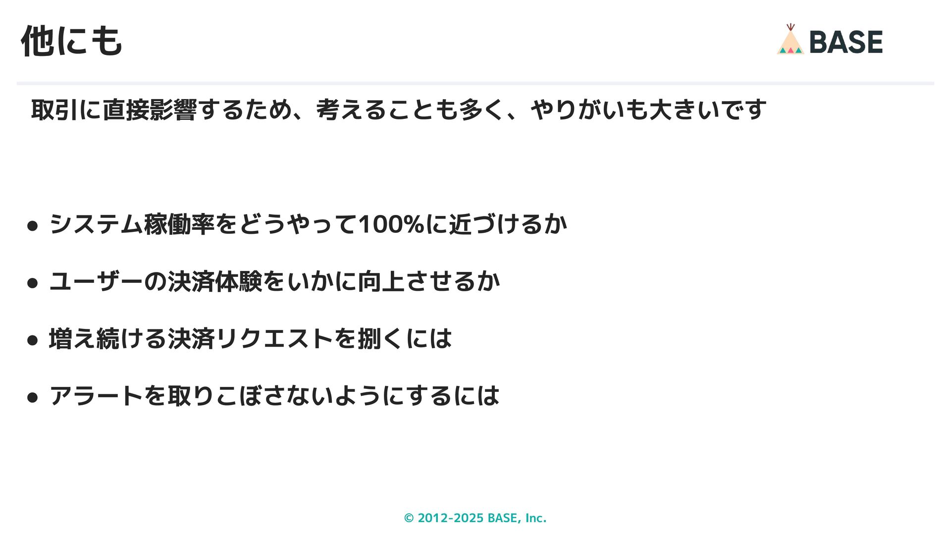 © 2012-2025 BASE, Inc. 他にも 8 取引に直接影響するため、考えることも多く、やりがいも大きいです • システム稼働率をどうやって100%に近づけるか •