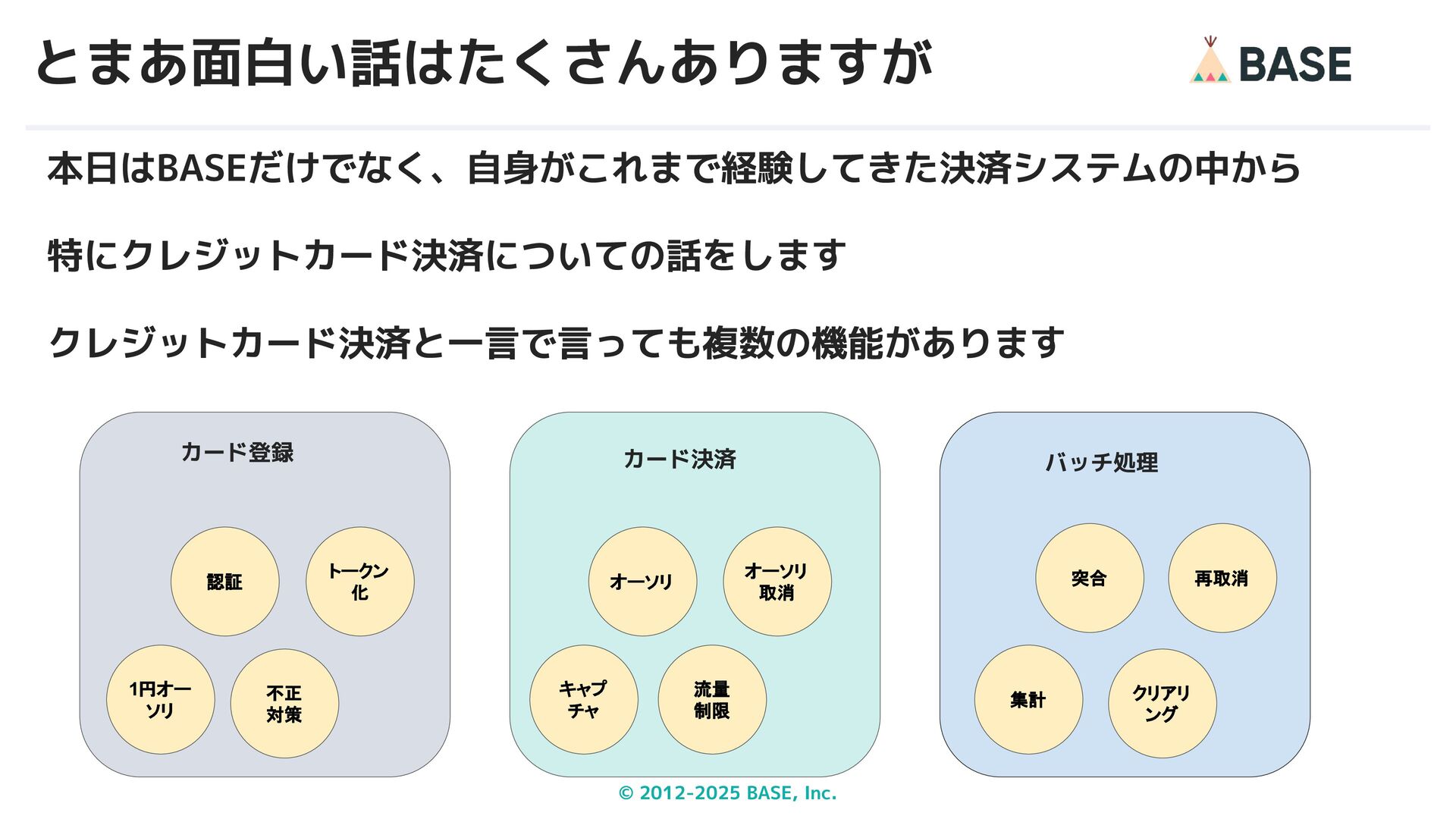 © 2012-2025 BASE, Inc. とまあ面白い話はたくさんありますが 本日はBASEだけでなく、自身がこれまで経験してきた決済システムの中から 特にクレジットカード決済についての話をします クレジットカード決済と一言で言っても複数の機能があります 1円オー ソリ