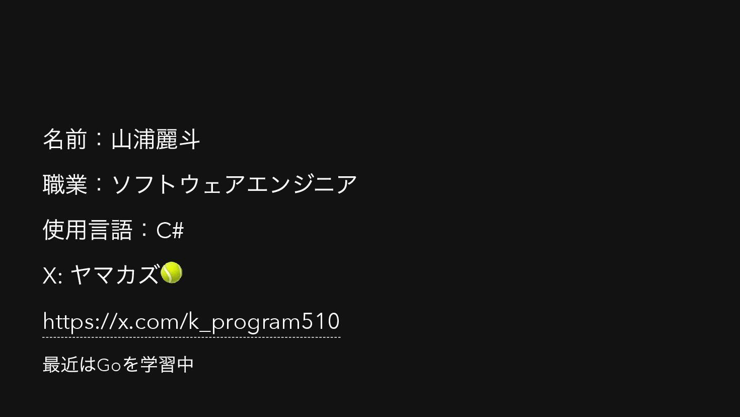 名前:山浦麗斗 職業:ソフトウェアエンジニア 使用言語:C# X: ヤマカズ🎾 https://x.com/k_program510 最近はGo を学習中