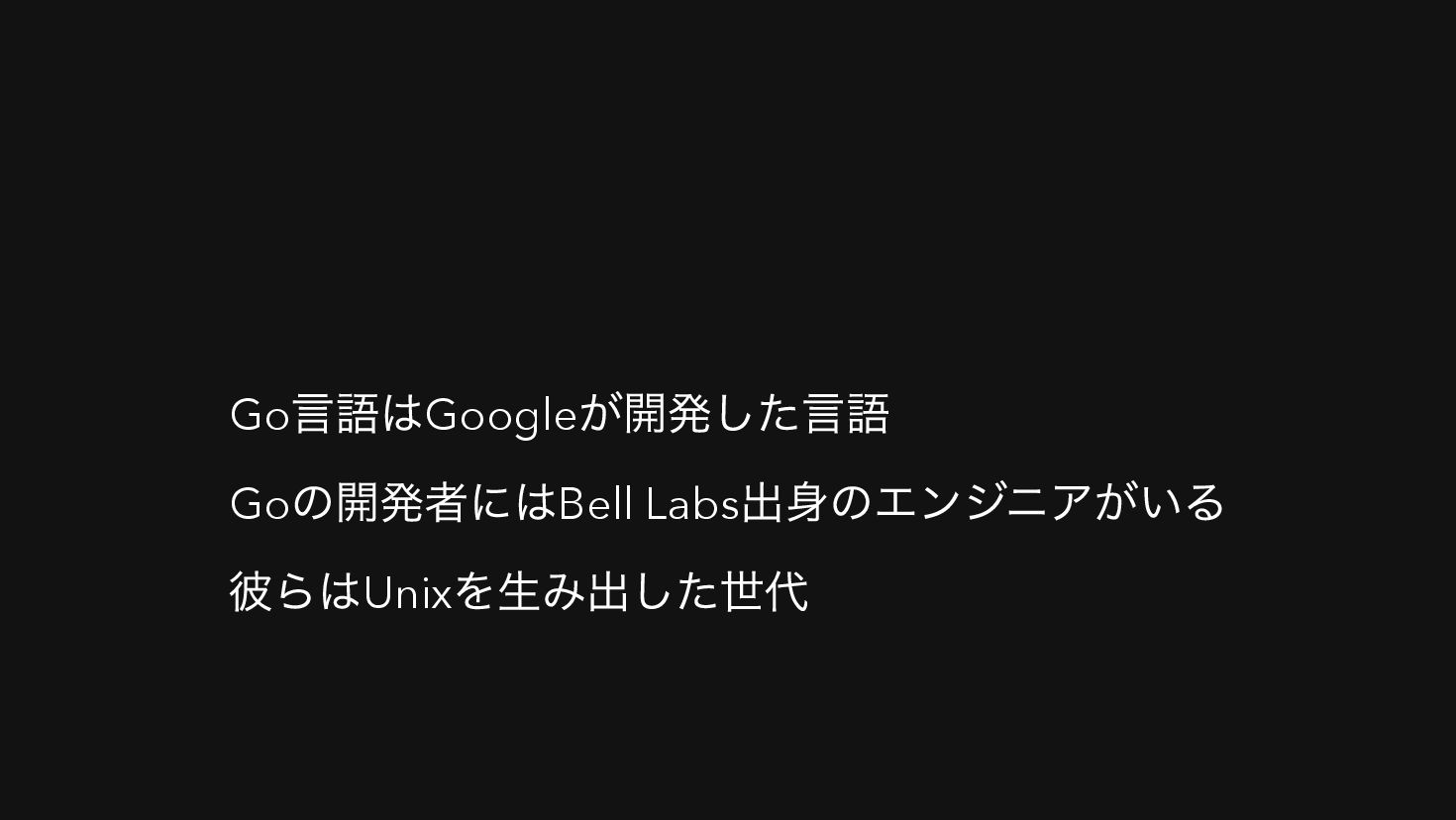 Go 言語はGoogle が開発した言語 Go の開発者にはBell Labs 出身のエンジニアがいる 彼らはUnix を生み出した世代