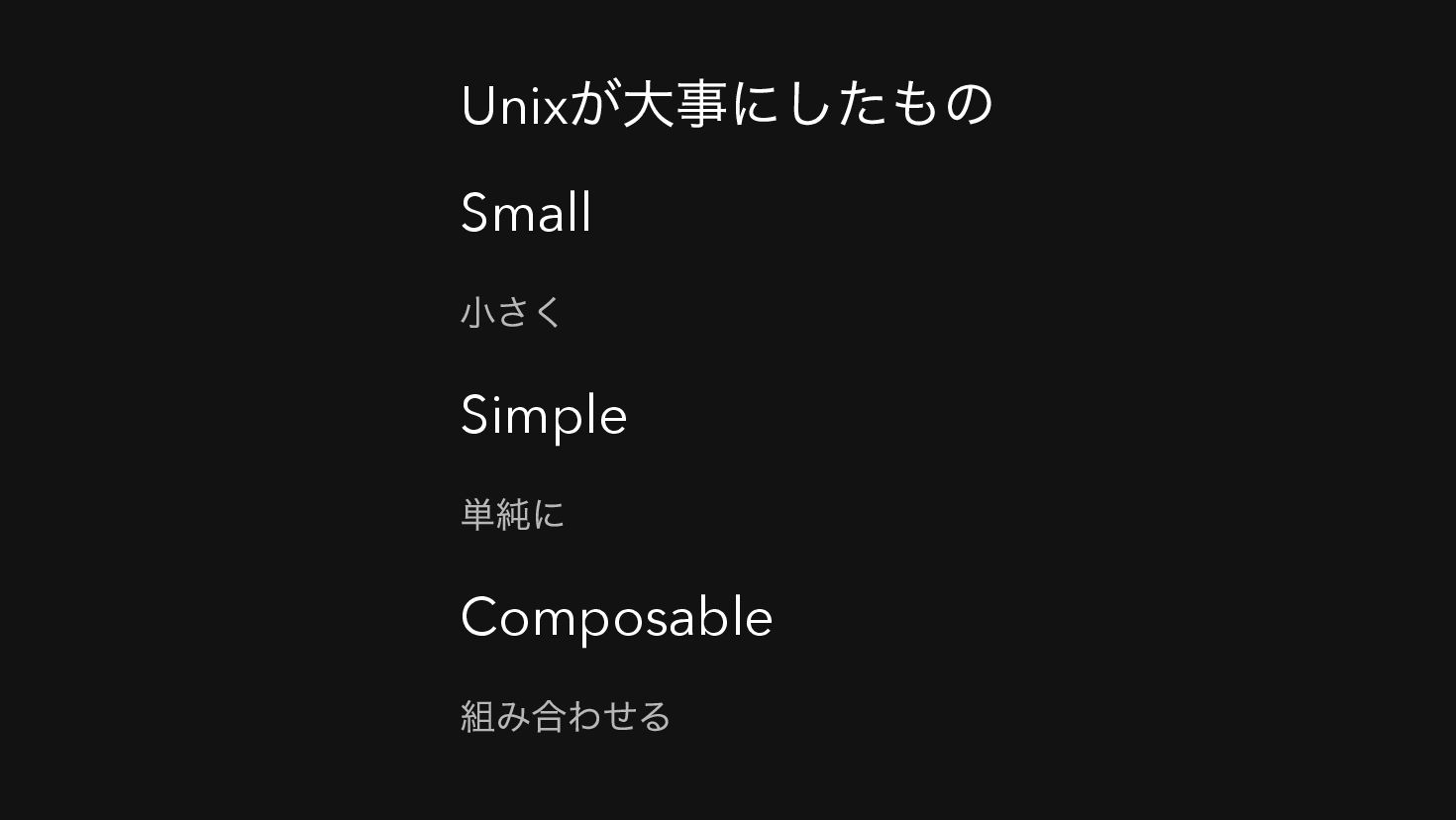Unix が大事にしたもの Small Simple Composable 小さく 単純に 組み合わせる