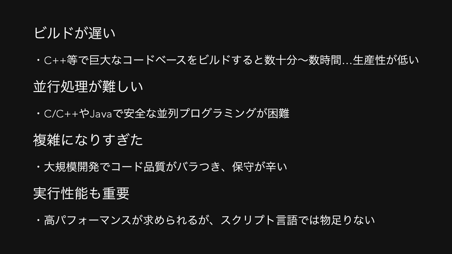 ビルドが遅い ・C++ 等で巨大なコードベースをビルドすると数十分〜数時間… 生産性が低い 並行処理が難しい ・C/C++ やJava で安全な並列プログラミングが困難 複雑になりすぎた ・大規模開発でコード品質がバラつき、保守が辛い